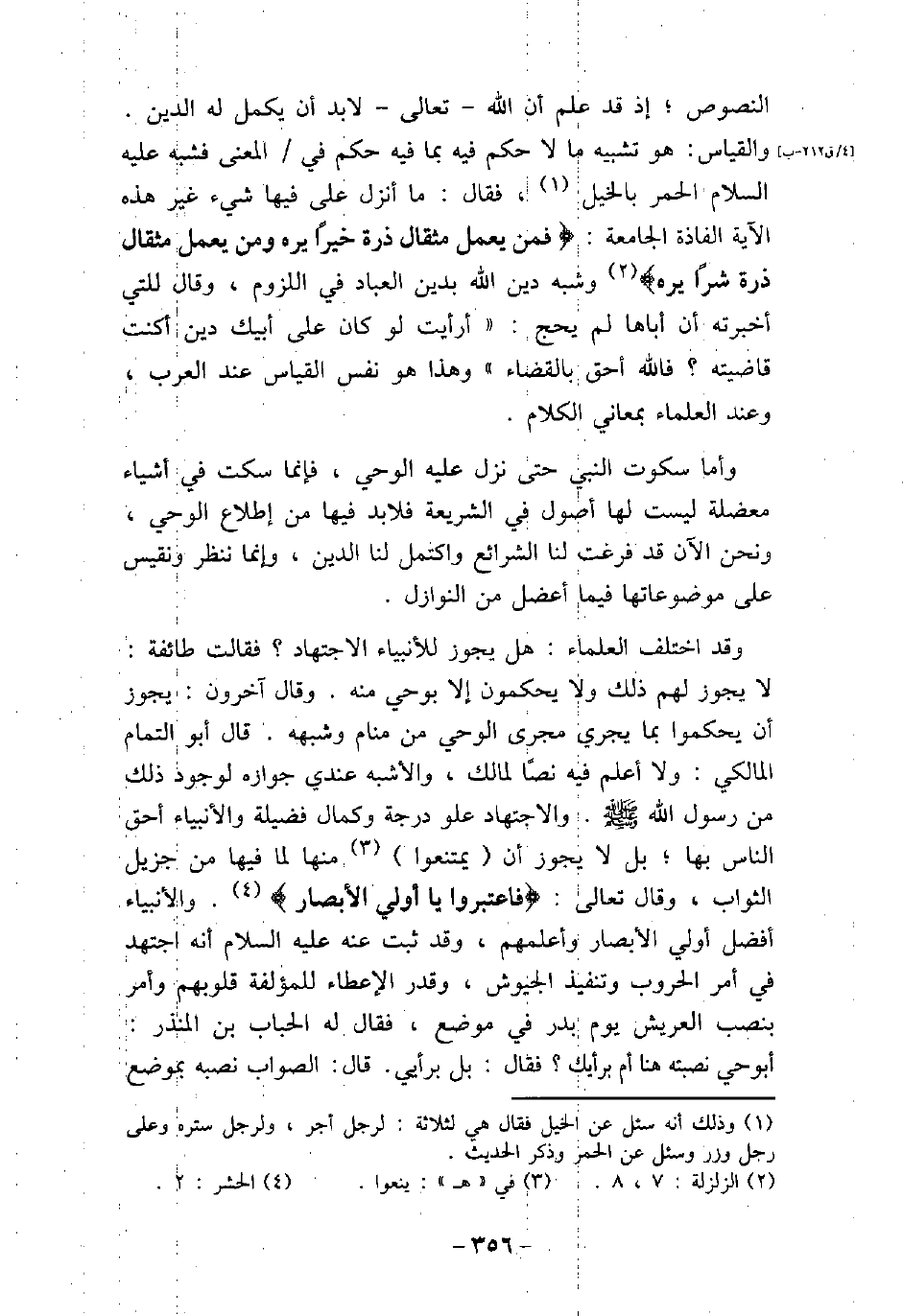 النصوص؛ إذ قد علم أن الله تعالى لابد أن يكمل له الدين. والقياس: هو تشبيه ما لا حكم فيه بما حكم فى المعنى فشبه (صلى الله عليه وسلم) الحمر بالخيل، فقال: ما أنزل على فيها شىء غير هذه الآية الفاذة الجامعة: (فَمَن يَعْمَلْ مِثْقَالَ ذَرَّةٍ خَيْرًا يَرَهُ وَمَن يَعْمَلْ مِثْقَالَ ذَرَّةٍ شَرًّا يَرَهُ) [الزلزلة: 7، 8] ، وشبه دين الله بدين العباد فى اللزوم، وقال للتى أخبرته أن أباها لم يحج: (أرأيت لو كان على أبيك دين أكنت قاضيته؟ فالله أحق بالقضاء) وهذا هو نفس القياس عند العرب، وعند العلماء بمعانى الكلام. وأما سكوت النبى حتى نزل عليه الوحى، فإنما سكت فى أشياء معضلة ليست لها أصول فى الشريعة فلابد فيها من إطلاع الوحى، ونحن الآن قد فرغت لنا الشرائع واكتمل لنا الدين، وإنما ننظر ونقيس على موضاعاتها فيما أعضل من النوازل. وقد اختلف العلماء: هل يجوز للأنبياء الاجتهاد؟ فقالت طائفة: لا يجوز لهم ذلك ولا يحكمون إلا بوحى منه. وقال آخرون: يجوز أن يحكموا بما يجرى مجرى من منام وشبهه. قال أبو التمام المالكى: ولا أعلم فيه نصًا لمالك، والأشبه عندى جوازه لوجود ذلك من رسول الله (صلى الله عليه وسلم) . والاجتهاد علو درجة وكمال فضيلة والأنبياء أحق الناس به؛ بل لا يجوز أن يمتنعوا منها لما فيها من جزيل الثواب، وقال تعالى: (فَاعْتَبِرُوا يَا أُولِى الأَبْصَارِ) [الحشر: 2] ، والأنبياء أفضل أولى الأبصار وأعلمهم، وقد ثبت عنه (صلى الله عليه وسلم) أنه اجتهد فى أمر الحروب وتنفيذ الجيوش، وقدر الإعطاء للمؤلفة قلوبهم وأمر بنصب العريش يوم بدر فى موضع، فقال له الحباب بن المنذر: أبوحى نصبته هنا أم برأيك؟ فقال: بل برأيى. قال: الصواب نصبه بموضع