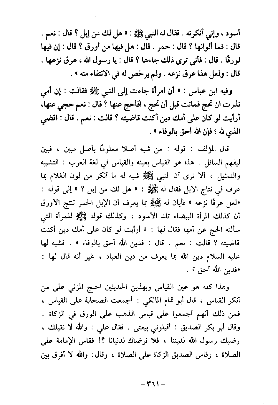 أَسْوَدَ، وَإِنِّى أَنْكَرْتُهُ، فَقَالَ لَهُ النَّبِىّ (صلى الله عليه وسلم) : (هَلْ لَكَ مِنْ إِبِلٍ) ؟ قَالَ: نَعَمْ، قَالَ: (فَمَا أَلْوَانُهَا) ؟ قَالَ: حُمْرٌ، قَالَ: (هَلْ فِيهَا مِنْ أَوْرَقَ) ؟ قَالَ: إِنَّ فِيهَا لَوُرْقًا، قَالَ: (فَأَنَّى تُرَى ذَلِكَ جَاءَهَا) ، قَالَ: يَا رَسُولَ اللَّهِ، عِرْقٌ نَزَعَهَا، قَالَ: (وَلَعَلَّ هَذَا عِرْقٌ نَزَعَهُ) ، وَلَمْ يُرَخِّصْ لَهُ فِى الانْتِفَاءِ مِنْهُ. / 42 - وفيه: بْن عَبَّاس، أَنَّ امْرَأَةً جَاءَتْ إِلَى النَّبِىِّ (صلى الله عليه وسلم) ، فَقَالَتْ: إِنَّ أُمِّى نَذَرَتْ أَنْ تَحُجَّ، فَمَاتَتْ قَبْلَ أَنْ تَحُجَّ، أَفَأَحُجَّ عَنْهَا؟ قَالَ: (نَعَمْ، حُجِّى عَنْهَا، أَرَأَيْتِ لَوْ كَانَ عَلَى أُمِّكِ دَيْنٌ أَكُنْتِ قَاضِيَتَهُ) ؟ قَالَتْ: نَعَمْ، فَقَالَ: (اقْضُوا اللَّهَ الَّذِى لَهُ، فَإِنَّ اللَّهَ أَحَقُّ بِالْوَفَاءِ) . قال المؤلف: قوله: من شبه أصلا معلومًا بأصل مبين، فبين ليفهم السائل. هذا هو القياس بعينه والقياس فى لغة العرب: التشبيه والتمثيل، ألا ترى أن النبى (صلى الله عليه وسلم) شبه له ما أنكر من لون الغلام بما عرف فى نتاج الإبل فقال له: (هل لك من إبل؟) إلى قوله: (لعل عرقًا نزعه) فأبان له (صلى الله عليه وسلم) بما يعرف أن الإبل الحمر تنتج الأورق أن كذلك المرأة البيضاء تلد الأسود، وكذلك قوله (صلى الله عليه وسلم) للمرأة التى سألته الحج عن أمها فقال لها: (أرأيت لو كان على أمك دين أكنت قاضيته؟ قالت: نعم. قال: فدين الله أحق بالوفاء) . فشبه لها (صلى الله عليه وسلم) دين الله بما يعرف من دين العباد، غير أنه قال لها: (فدين الله أحق) . وهذا كله هو عين القياس وبهذين الحديثين احتج المزنى على من أنكر القياس، قال أبو تمام المالكى: اجتمعت الصحابة على القياس، فمن ذلك أنهم أجمعوا على قياس الذهب على ورق فى الزكاة. وقال أبو بكر الصديق: أقيلونى بيعتى. فقال على: والله لا نقيلك، رضيك رسول الله لديننا، فلا نرضاك لدنيانا؟ فقياس الإمامة على الصلاة، وقياس الصديق الزكاة على الصلاة، وقال: والله لا أفرق بين
