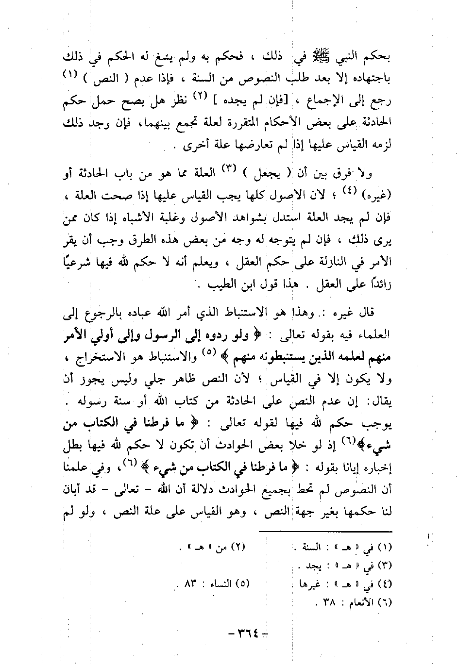 بحكم النبي (صلى الله عليه وسلم) فى ذلك، فحكم به ولم يسغ له الحكم فى ذلك باجتهاده إلا بعد طلب النصوص من السنة، فإذا عدم النص رجع إلى الإجماع، فإن لم يجده نظر هل يصح حمل حكم الحادثة على بعض الأحكام المتقررة لعلة تجمع بينهما، فإن وجد ذلك لزمه القياس عليها إذا لم تعارضها علة أخرى. ولا فرق بين أن يجعل العلة مما هو من باب الحادثة أو غيره؛ لأن الأصول كلها يجب القياس عليها إذا صحت العلة، فإن لم يجد العلة استدل بشواهد الأصول وغلبة الأشباه إذا كان ممن يرى ذلك، فإن لم يتوجه له وجه من بعض هذه الطرق وجب أن يقر الأمر فى النازلة على حكم العقل، ويعلم أنه لا حكم لله فيها شرعيًا زائدًا على العقل. هذا قول ابن الطيب. قال غيره: وهذا هو الاستنباط الذى أمر الله عباده بالرجوع إلى العلماء فيه بقوله تعالى: (وَلَوْ رَدُّوهُ إِلَى الرَّسُولِ وَإِلَى أُوْلِى الأَمْرِ مِنْهُمْ لَعَلِمَهُ الَّذِينَ يَسْتَنبِطُونَهُ مِنْهُمْ) [النساء: 83] ، والاستنباط هو الاستخراج، ولا يكون إلا فى القياس؛ لأن النص ظاهر جلى وليس يجوز أن يقال: إن عدم النص على الحادثة من كتاب الله أو سنة رسوله. يوجب حكم لله فيها لقوله تعالى: (مَّا فَرَّطْنَا فِى الكِتَابِ مِن شَىْءٍ) [الأنعام: 38] ، إذ لو خلا بعض الحوادث أن تكون لا حكم لله فيها بطل إخباره إيانا بقوله: (مَّا فَرَّطْنَا فِى الكِتَابِ مِن شَىْءٍ) [الأنعام: 38] ، وفى علمنا أن النصوص لم تحط بجميع الحوادث دلالة أن الله تعالى قد أبان لنا حكمها بغير جهة النص، وهو القياس على علة النص، ولو لم