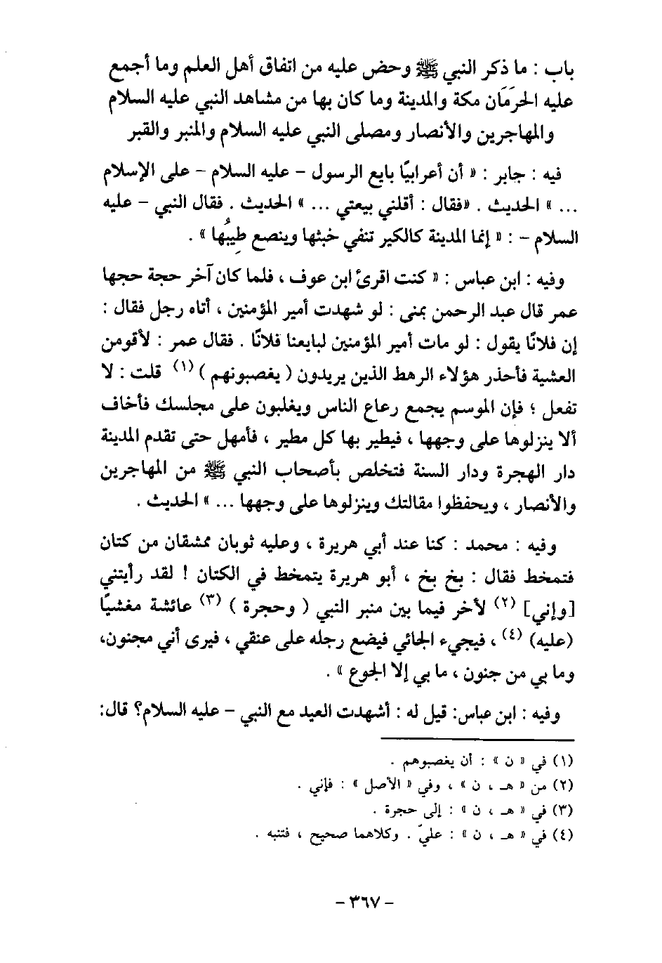 / 48 - فيه: جَابِر، أَنَّ أَعْرَابِيًّا بَايَعَ الرسول (صلى الله عليه وسلم) عَلَى الإسْلامِ. . . الحديث. فَقَالَ: أَقِلْنِى بَيْعَتِى. . . الحديث. فَقَالَ النَّبِىّ (صلى الله عليه وسلم) : (إِنَّمَا الْمَدِينَةُ كَالْكِيرِ تَنْفِى خَبَثَهَا، وَيَنْصَعُ طِيبُهَا) . / 49 - وفيه: ابْن عَبَّاس، كُنْتُ أُقْرِئُ عَبْدَالرَّحْمَنِ بْنَ عَوْفٍ، فَلَمَّا كَانَ آخِرُ حَجَّةٍ حَجَّهَا عُمَرُ، فَقَالَ عَبْدُالرَّحْمَنِ بِمِنًى: لَوْ شَهِدْتَ أَمِيرَ الْمُؤْمِنِينَ أَتَاهُ رَجُلٌ قَالَ: إِنَّ فُلانًا يَقُولُ: لَوْ مَاتَ أَمِيرُ الْمُؤْمِنِينَ لَبَايَعْنَا فُلانًا، فَقَالَ عُمَرُ: لأقُومَنَّ الْعَشِيَّةَ، فَأُحَذِّرَ هَؤُلاءِ الرَّهْطَ الَّذِينَ يُرِيدُونَ أَنْ يَغْصِبُوهُمْ، قُلْتُ: لا تَفْعَلْ، فَإِنَّ الْمَوْسِمَ يَجْمَعُ رَعَاعَ النَّاسِ يَغْلِبُونَ عَلَى مَجْلِسِكَ، فَأَخَافُ أَنْ لا يُنْزِلُوهَا عَلَى وَجْهِهَا، فَيُطِيرُ بِهَا كُلُّ مُطِيرٍ، فَأَمْهِلْ حَتَّى تَقْدَمَ الْمَدِينَةَ دَارَ الْهِجْرَةِ وَدَارَ السُّنَّةِ، فَتَخْلُصَ بِأَصْحَابِ النَّبِىّ (صلى الله عليه وسلم) مِنَ الْمُهَاجِرِينَ وَالأنْصَارِ، فَيَحْفَظُوا مَقَالَتَكَ، وَيُنْزِلُوهَا عَلَى وَجْهِهَا. . . الحديث. / 50 - وفيه: مُحَمَّد، كُنَّا عِنْدَ أَبِى هُرَيْرَةَ، وَعَلَيْهِ ثَوْبَانِ مُمَشَّقَانِ مِنْ كَتَّانٍ فَتَمَخَّطَ، فَقَالَ: بَخْ بَخْ أَبُو هُرَيْرَةَ، يَتَمَخَّطُ فِى الْكَتَّانِ، لَقَدْ رَأَيْتُنِى وَإِنِّى لأخِرُّ فِيمَا بَيْنَ مِنْبَرِ النَّبِىّ (صلى الله عليه وسلم) وَحُجْرَةِ عَائِشَةَ مَغْشِيًّا عَلَيه، فَيَجِىءُ الْجَائِى فَيَضَعْ رِجْلَهُ عَلَى عُنُقِى، وَيُرَى أَنِّى مَجْنُونٌ، وَمَا بِى مِنْ جُنُونٍ مَا بِى إِلا الْجُوعُ. / 51 - وفيه: ابْن عَبَّاس، قيل له: أَشَهِدْتَ الْعِيدَ مَعَ النَّبِيِّ - عليه السلام -؟ قَالَ: