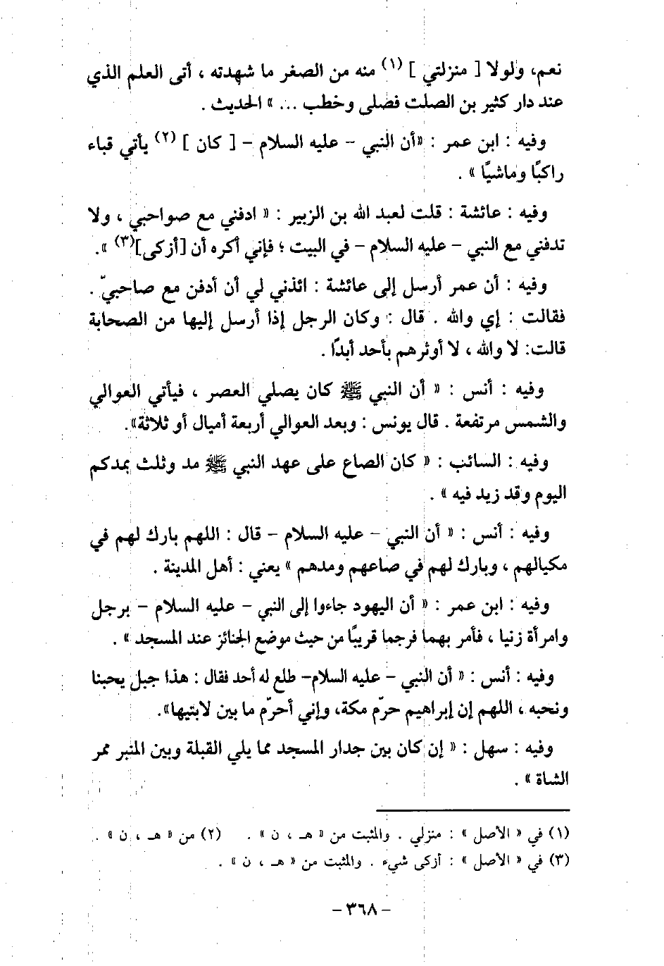 نَعَمْ، وَلَوْلا مَنْزِلَتِى مِنْهُ مِنَ الصِّغَرِ مَا شَهِدْتُهُ، فَأَتَى الْعَلَمَ الَّذِى عِنْدَ دَارِ كَثِيرِ بْنِ الصَّلْتِ، فَصَلَّى، وَخَطَبَ. . . الحديث. / 52 - وفيه: ابْن عُمَرَ، أَنَّ النَّبِىَّ (صلى الله عليه وسلم) كَانَ يَأْتِى قُبَاءً رَاكِبًا وَمَاشِيًا. / 53 - وفيه: عَائِشَةَ، قَالَتْ لِعَبْدِاللَّهِ بْنِ الزُّبَيْرِ: ادْفِنِّى مَعَ صَوَاحِبِى، وَلا تَدْفِنِّى مَعَ النَّبِىِّ (صلى الله عليه وسلم) فِى الْبَيْتِ، فَإِنِّى أَكْرَهُ أَنْ أُزَكَّى. / 54 - وفيه: أَنَّ عُمَرَ أَرْسَلَ إِلَى عَائِشَةَ: ائْذَنِى لِى أَنْ أُدْفَنَ مَعَ صَاحِبَىَّ، فَقَالَتْ: إِى وَاللَّهِ، قَالَ: وَكَانَ الرَّجُلُ إِذَا أَرْسَلَ إِلَيْهَا مِنَ الصَّحَابَةِ، قَالَتْ: لا وَاللَّهِ، لا أُوثِرُهُمْ بِأَحَدٍ أَبَدًا. / 55 - وفيه: أَنَس، أَنَّ النَّبِىّ (صلى الله عليه وسلم) كَانَ يُصَلِّى الْعَصْرَ، فَيَأْتِى الْعَوَالِىَ، وَالشَّمْسُ مُرْتَفِعَةٌ. وَقَالَ يُونُسَ: وَبُعْدُ الْعَوَالِىَ أَرْبَعَةُ أَمْيَالٍ أَوْ ثَلاثَةٌ. / 56 - وفيه: السَّائِب، كَانَ الصَّاعُ عَلَى عَهْدِ النَّبِىِّ (صلى الله عليه وسلم) مُدًّا وَثُلُثًا بِمُدِّكُمُ الْيَوْمَ، وَقَدْ زِيدَ فِيهِ. / 57 - وفيه: أَنَس، أَنَّ النَّبِىّ (صلى الله عليه وسلم) قَالَ: (اللَّهُمَّ بَارِكْ لَهُمْ فِى مِكْيَالِهِمْ، وَبَارِكْ لَهُمْ فِى صَاعِهِمْ وَمُدِّهِمْ) ، يَعْنِى أَهْلَ الْمَدِينَةِ. / 58 - وفيه: ابْن عُمَرَ، أَنَّ الْيَهُودَ جَاءُوا إِلَى النَّبِىِّ (صلى الله عليه وسلم) بِرَجُلٍ وَامْرَأَةٍ زَنَيَا، فَأَمَرَ بِهِمَا فَرُجِمَا قَرِيبًا مِنْ حَيْثُ تُوضَعُ الْجَنَائِزُ عِنْدَ الْمَسْجِدِ. / 59 - وفيه: أَنَس، أَنَّ النَّبِىّ (صلى الله عليه وسلم) طَلَعَ لَهُ أُحُدٌ، فَقَالَ: (هَذَا جَبَلٌ يُحِبُّنَا وَنُحِبُّهُ، اللَّهُمَّ إِنَّ إِبْرَاهِيمَ حَرَّمَ مَكَّةَ، وَإِنِّى أُحَرِّمُ مَا بَيْنَ لابَتَيْهَا) . / 60 - وفيه: سَهْلٍ، أَنَّهُ كَانَ بَيْنَ جِدَارِ الْمَسْجِدِ مِمَّا يَلِى الْقِبْلَةَ وَبَيْنَ الْمِنْبَرِ مَمَرُّ الشَّاةِ.