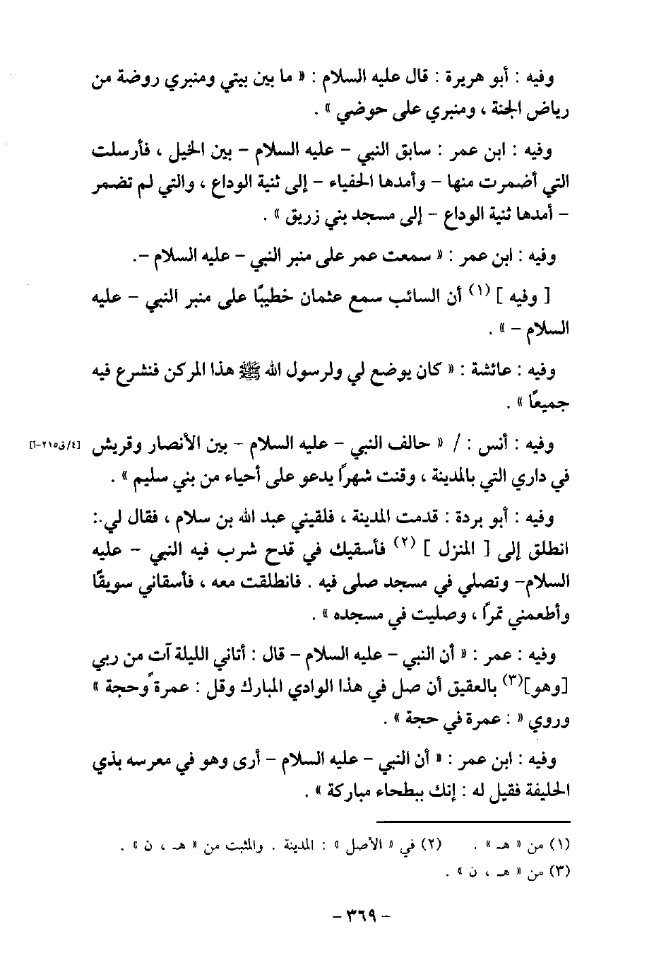 / 61 - وفيه: أَبُو هُرَيْرَةَ، قَالَ (صلى الله عليه وسلم) : (مَا بَيْنَ بَيْتِي وَمِنْبَرِي رَوْضَةٌ مِنْ رِيَاضِ الْجَنَّةِ، وَمِنْبَرِي عَلَى حَوْضِي) . / 62 - وفيه: ابْن عُمَرَ، سَابَقَ النَّبِىُّ (صلى الله عليه وسلم) بَيْنَ الْخَيْلِ، فَأُرْسِلَتِ الَّتِى ضُمِّرَتْ مِنْهَا، وَأَمَدُهَا إِلَى الْحَفْيَاءِ إِلَى ثَنِيَّةِ الْوَدَاعِ، وَالَّتِى لَمْ تُضَمَّرْ أَمَدُهَا ثَنِيَّةُ الْوَدَاعِ إِلَى مَسْجِدِ بَنِى زُرَيْقٍ. / 63 - وفيه: ابْن عُمَرَ، سَمِعْتُ عُمَرَ عَلَى مِنْبَرِ النَّبِىِّ (صلى الله عليه وسلم) . / 64 - وفيه: أن السَّائِبُ، سَمِعَ عُثْمَانَ بْنَ عَفَّانَ خَطَبَنَا عَلَى مِنْبَرِ النَّبِىِّ (صلى الله عليه وسلم) . / 65 - وفيه: عَائِشَةَ، كَانَ يُوضَعُ لِى وَلِرَسُولِ اللَّهِ (صلى الله عليه وسلم) هَذَا الْمِرْكَنُ، فَنَشْرَعُ فِيهِ جَمِيعًا. / 66 - وفيه: أَنَس، حَالَفَ النَّبِىُّ (صلى الله عليه وسلم) بَيْنَ الأنْصَارِ وَقُرَيْشٍ فِى دَارِى الَّتِى بِالْمَدِينَةِ، وَقَنَتَ شَهْرًا يَدْعُو عَلَى أَحْيَاءٍ مِنْ بَنِى سُلَيْمٍ. / 67 - وفيه: أَبُو بُرْدَةَ، قَدِمْتُ الْمَدِينَةَ، فَلَقِيَنِى عَبْدُاللَّهِ بْنُ سَلامٍ، فَقَالَ لِى: انْطَلِقْ إِلَى الْمَنْزِلِ، فَأَسْقِيَكَ فِى قَدَحٍ شَرِبَ فِيهِ النَّبِىّ (صلى الله عليه وسلم) وَتُصَلِّى فِى مَسْجِدٍ صَلَّى فِيهِ النَّبِىُّ (صلى الله عليه وسلم) ، فَانْطَلَقْتُ مَعَهُ، فَسَقَانِى سَوِيقًا، وَأَطْعَمَنِى تَمْرًا، وَصَلَّيْتُ فِى مَسْجِدِهِ. / 68 - وفيه: عُمَرَ، أن النَّبِىّ (صلى الله عليه وسلم) قَالَ: (أَتَانِى اللَّيْلَةَ آتٍ مِنْ رَبِّى، وَهُوَ بِالْعَقِيقِ، أَنْ صَلِّ فِى هَذَا الْوَادِى الْمُبَارَكِ، وَقُلْ: عُمْرَةٌ وَحَجَّةٌ) . وروى (عُمْرَةٌ فِى حَجَّةٍ) . / 69 - وفيه: ابْن عُمَرَ، أن النَّبِىّ (صلى الله عليه وسلم) أُرِىَ وَهُوَ فِى مُعَرَّسِهِ بِذِى الْحُلَيْفَةِ، فَقِيلَ لَهُ: إِنَّكَ بِبَطْحَاءَ مُبَارَكَةٍ.
