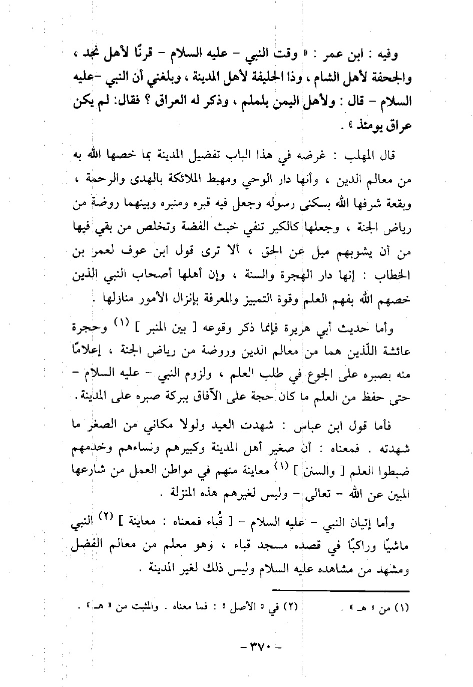 / 70 - وفيه: ابْن عُمَرَ، وَقَّتَ النَّبِيُّ (صلى الله عليه وسلم) قَرْنًا لأهْلِ نَجْدٍ، وَالْجُحْفَةَ لأهْلِ الشَّأْمِ، وَذَا الْحُلَيْفَةِ لأهْلِ الْمَدِينَةِ، وَبَلَغَنِي أَنَّ النَّبِيَّ (صلى الله عليه وسلم) قَالَ: (وَلأهْلِ الْيَمَنِ يَلَمْلَمُ، وَذُكِرَ له الْعِرَاقُ؟ فَقَالَ: (لَمْ يَكُنْ عِرَاقٌ يَوْمَئِذٍ) . قال المهلب: غرضه فى هذا الباب تفضيل المدينة بما خصها الله به من معالم الدين، وأنها دار الوحى ومهبط الملائكة بالهدى والرحمة، وبقعة شرفها الله بسكنى رسوله وجعل فيه قبره ومنبره وبينهما روضة من رياض الجنة، وجعلها كالكير تنفى خبث الفضة وتخلص من بقى فيها من أن يشوبهم ميل عن الحق، ألا ترى قول ابن عوف لعمر بن الخطاب: إنها دار الهجرة والسنة، وإن أهلها أصحاب النبى الذين خصهم الله بفهم العلم وقوة التمييز والمعرفة بإنزال الأمور منازلها. وأما حديث أبى هريرة فإنما ذكر وقوعه بين المنبر وحجرة عائشة الذّين هما من معالم الدين وروضة من رياض الجنة، إعلامًا منه بصبره على الجوع فى طلب العلم، ولزوم النبى (صلى الله عليه وسلم) حتى حفظ من العلم ما كان حجة على الآفاق ببركة صبره على المدينة. فأما قول ابن عباس: شهدت العيد ولولا مكانى من الصغر ما شهدته. فمعناه: أن صغير أهل المدينة وكبيرهم ونسائهم وخدمهم ضبطوا العلم والسنن معاينة منهم فى مواطن العمل من شارعها المبين عن الله تعالى وليس لغيرهم هذه المنزلة. وأما إتيان النبى (صلى الله عليه وسلم) قُباء فمعناه: معاينة النبى ماشيًا وراكبًا فى قصده مسجد قباء، وهو معلم من معالم الفضل ومشهد من مشاهده (صلى الله عليه وسلم) وليس ذلك لغير المدينة.