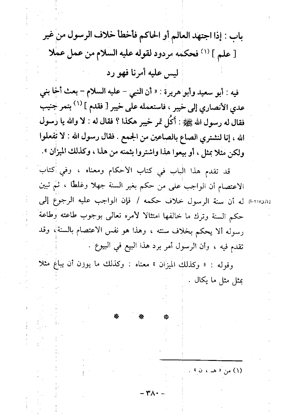 / 75 - فيه: أَبُو سَعِيد، وَأَبُو هُرَيْرَةَ، أَنَّ النَّبِيّ (صلى الله عليه وسلم) بَعَثَ أَخَا بَنِي عَدِيٍّ الأنْصَارِيَّ، إِلَى خَيْبَرَ، وَاسْتَعْمَلَهُ عَلَى خَيْبَرَ، فَقَدِمَ بِتَمْرٍ جَنِيبٍ، فَقَالَ لَهُ رَسُولُ اللَّهِ (صلى الله عليه وسلم) : (أَكُلُّ تَمْرِ خَيْبَرَ هَكَذَا) ؟ قَالَ: لا، وَاللَّهِ يَا رَسُولَ اللَّهِ إِنَّا لَنَشْتَرِى الصَّاعَ بِالصَّاعَيْنِ مِنَ الْجَمْعِ، فَقَالَ رَسُولُ اللَّهِ (صلى الله عليه وسلم) : (لا تَفْعَلُوا، وَلَكِنْ مِثْلا بِمِثْلٍ أَوْ بِيعُوا هَذَا، وَاشْتَرُوا بِثَمَنِهِ مِنْ هَذَا، وَكَذَلِكَ الْمِيزَانُ) . قد تقدم هذا الباب فى كتاب الأحكام وفى كتاب الاعتصام ومعناه أن الواجب على من حكم بغير السنة جهلا وغلطًا، ثم تبين له أن سنة الرسول خلاف حكمه فإن الواجب عليه الرجوع إلى حكم السنة وترك ما خالفها امتثالا لأمره تعالى بوجوب طاعته وطاعة رسوله ألا يحكم بخلاف سنته، وهذا هو نفس الاعتصام بالسنة، وقد تقدم فيه، وأن الرسول أمر برد هذا البيع فى البيوع. وقوله: (وكذلك الميزان) معناه: وكذلك ما يوزن أن يباع مثلا بمثل مثل ما يكال.