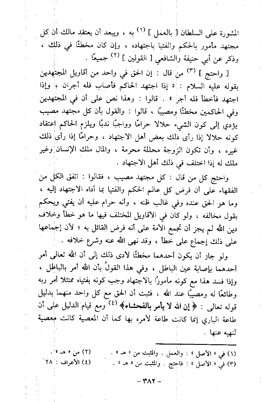 المشورة على السلطان بالعمل به، ويبعد أن يعتقد مالك أن كل مجتهد مأمور بالحكم والفتيا باجتهاده، وإن كان مخطئًا فى ذلك، وذكر عن أبى حنيفة والشافعى القولين جميعًا. واحتج من قال: إن الحق فى واحد من أقاويل المجتهدين بقوله (صلى الله عليه وسلم) : (إذا اجتهد الحاكم فأصاب فله أجران، وإذا اجتهد فأخطأ فله أجر) . قالوا: وهذا نص على أن فى المجتهدين وفى الحاكمين مخطئًا ومصيبًا، قالوا: والقول بأن كل مجتهد مصيب يؤدى إلى كون الشىء حلالا حرامًا وواجبًا ندبًا ويلزم الحاكم اعتقاد كونه حلالا إذا رأى ذلك بعض أهل الاجتهاد، وحرامًا إذا رأى ذلك غيره، وأن تكون الزوجة محللة محرمة، والمال ملك الإنسان وغير ملك له إذا اختلف فى ذلك أهل الاجتهاد. واحتج كل من قال: كل مجتهد مصيب، فقالوا: اتفق الكل من الفقهاء على أن فرض كل عالم الحكم والفتيا بما أداه الاجتهاد إليه، وما هو الحق عنده وفى غالب ظنه، وأنه حرام عليه أن يفتى ويحكم بقول مخالفه، ولو كان فى الأقاويل المختلف فيها ما هو خطأ وخلاف دين الله لم يجز أن تجمع الأمة على أن فرض القائل به؛ لأن إجماعها على ذلك إجماع على خطأ، وقد نهى الله عنه وشرع خلافه. ولو جاز أن يكون أحدهما مخطئًا لأدى ذلك إلى أن الله تعالى أمر أحدهما بإصابة عين الباطل، وفى هذا القولُ بأن الله أمر بالباطل، وإذا فسد هذا مع كونه مأمورًا بالاجتهاد وجب كونه بفتياه ممتثلا أمر ربه وطائعًا له ومصيبًا عند الله، فثبت أن الحق مع كل واحد منهما بدليل قوله تعالى: (إِنَّ اللهَ لاَ يَأْمُرُ بِالْفَحْشَاء) [الأعراف: 28] ، ومع قيام الدليل على أن طاعة البارى إنما كانت طاعة لأمره بها كما أن المعصية كانت معصية لنهيه عنها.