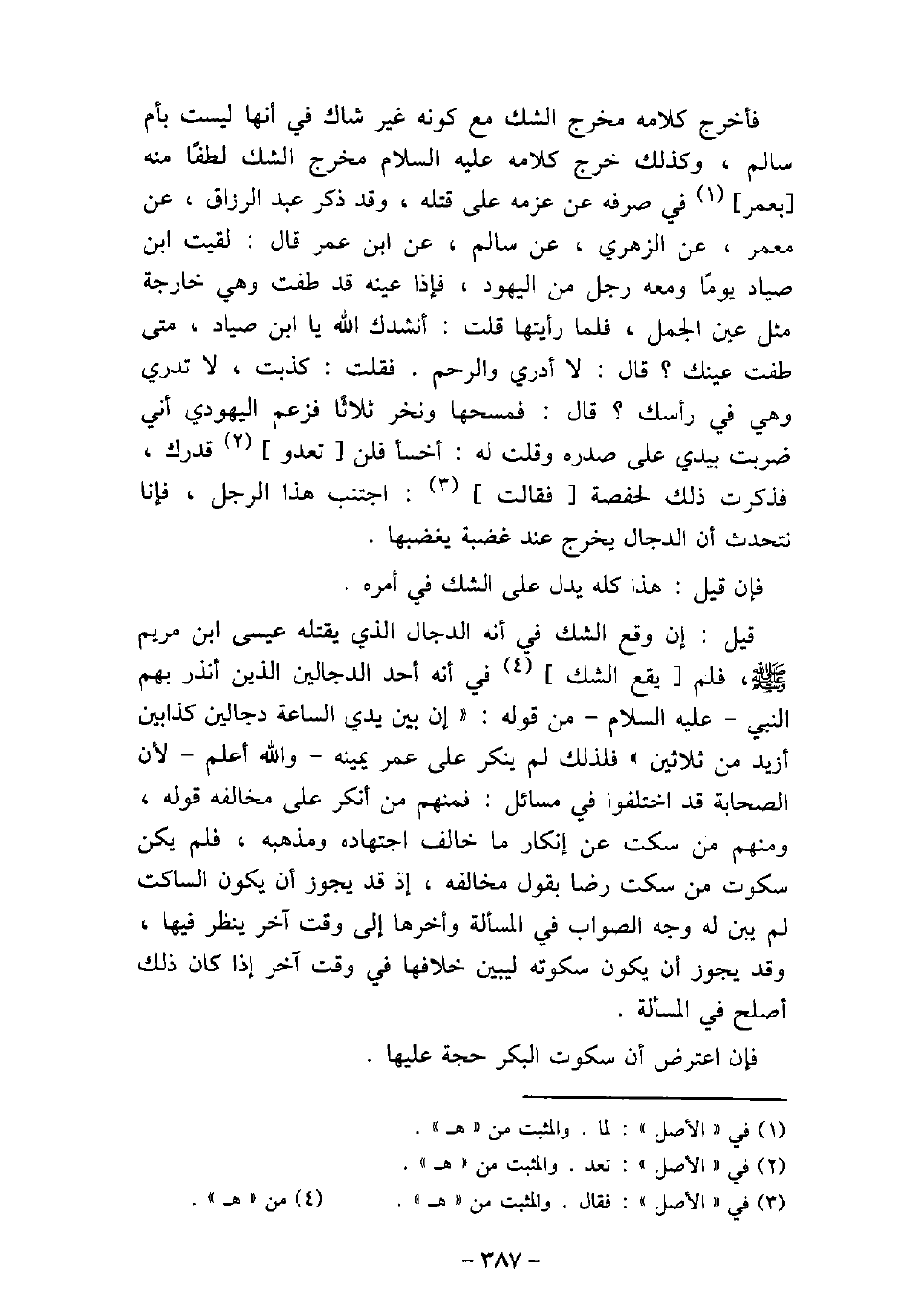 فأخرج كلامه مخرج الشك مع كونه غير شاك فى أنها ليست بأم سالم، وكذلك خرج كلامه (صلى الله عليه وسلم) مخرج الشك لطفًا منه بعمر فى صرفه عن عزمه على قتله، وقد ذكر عبد الرزاق، عن معمر، عن الزهرى، عن سالم، عن ابن عمر قال: لقيت ابن صياد يومًا ومعه رجل من اليهود، فإذا عينه قد طفت وهى خارجة مثل عين الجمل، فلما رأيتها قلت: أنشدك الله يا ابن صياد، متى طفت عينك؟ قال: لا أدرى والرحم. فقلت: كذبت، لا تدرى وهى فى رأسك؟ قال: فمسحها ونخر ثلاثًا فزعم اليهودي أني ضربت بيدي على صدره وقلت له: أخسأ فلن تعدو قدرك، فذكرت ذلك لحفصة فقالت: اجتنب هذا الرجل، فإنا نتحدث أن الدجال يخرج عند غضبة يغضبها. فإن قيل: هذا كله يدل على الشك فى أمره. قيل: إن وقع الشك فى أنه الدجال الذى يقتله عيسى ابن مريم (صلى الله عليه وسلم) ، فلم يقع الشك فى أنه أحد الدجالين الذين أنذر بهم النبي (صلى الله عليه وسلم) من قوله: (إن بين يدى الساعة دجالين كذابين أزيد من ثلاثين) فلذلك لم ينكر على عمر يمينه والله أعلم؛ لأن الصحابة قد اختلفوا فى مسائل: فمنهم من أنكر على مخالفة قوله، ومنهم من سكت عن إنكار ما خالف اجتهاده ومذهبه، فلم يكن سكوت من سكت رضا بقول مخالفه، إذ قد يجوز أن يكون الساكت لم يبين له وجه الصواب فى المسألة وأخرها إلى وقت آخر ينظر فيها، وقد يجوز أن يكون سكوته ليبين خلافها فى وقت آخر إذا كان ذلك أصلح فى المسألة. فإن اعترض أن سكوت البكر حجة عليها.