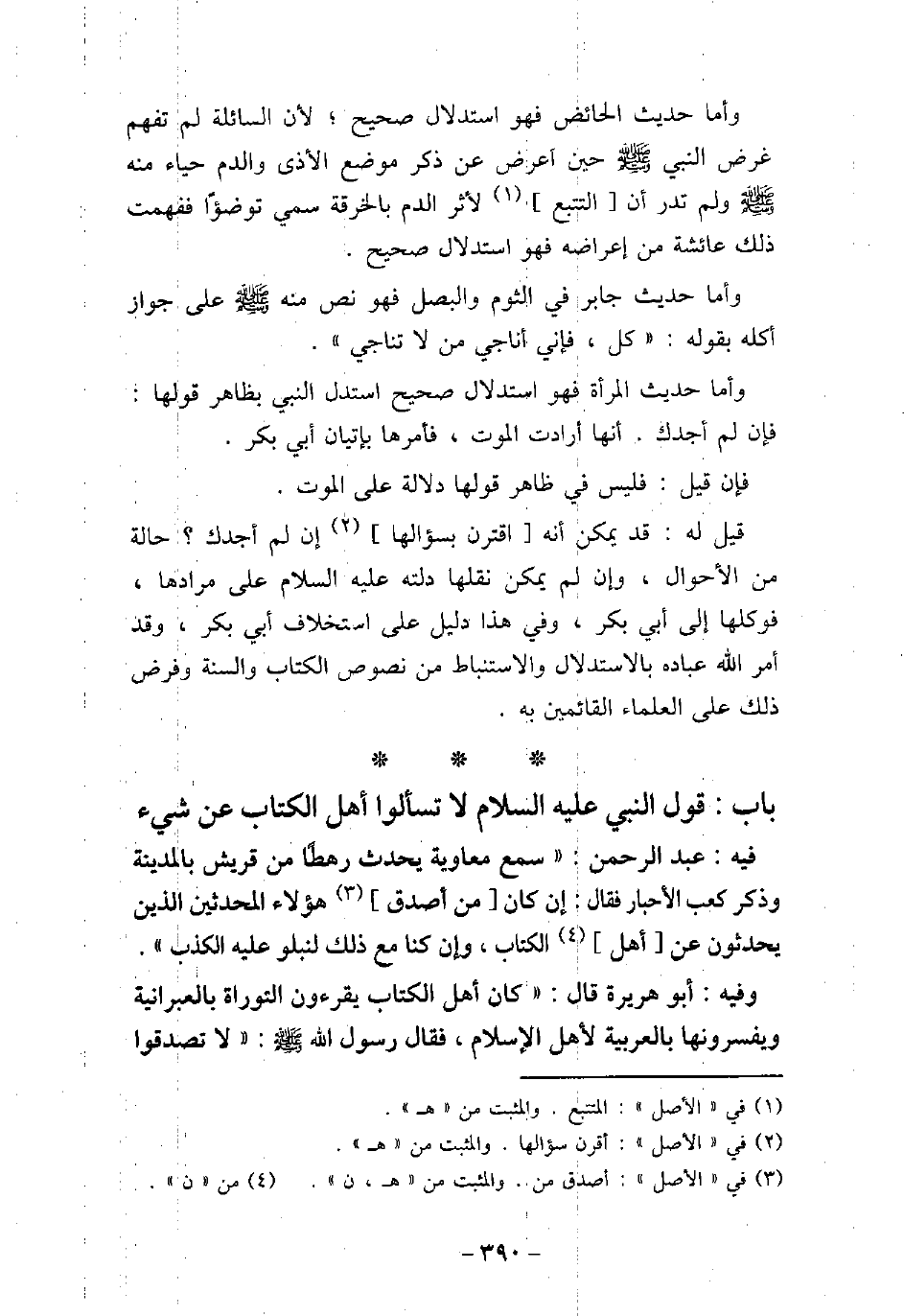وأما حديث الحائض فهو استدلال صحيح؛ لأن السائلة لم تفهم غرض النبي (صلى الله عليه وسلم) حين أعرض عن ذكر موضع الأذى والدم حياء منه (صلى الله عليه وسلم) ولم تدر أن التتبع لأثر الدم بالحرقة سمى توضؤًا ففهمت ذلك عائشة من إعراضه فهو استدلال صحيح. وأما حديث جابر فى الثوم والبصل فهو نص منه (صلى الله عليه وسلم) على جواز أكله بقوله: (كل، فإنى أناجى من لا تناجى) . وأما حديث المرأة فهو استدلال صحيح استدل النبى بظاهر قولها: فإن لم أجدك. أنها أرادت الموت، فأمرها بإتيان أبى بكر. قيل له: قد يمكن أنه اقترن بسؤالها إن لم أجدك؟ حالة من الأحوال، وإن لم يكن نقلها دلته (صلى الله عليه وسلم) على مرادها، فوكلها إلى أبى بكر، وفى هذا دليل على استخلاف أبى بكر، وقد أمر الله عباده بالاستدلال والاستنباط من نصوص الكتاب والسنة وفرض ذلك على العلماء القائمين به.