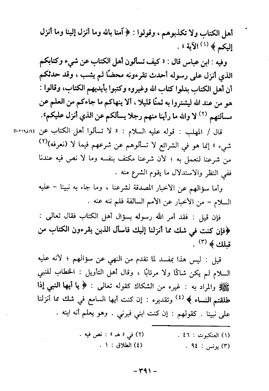 أَهْلَ الْكِتَابِ وَلا تُكَذِّبُوهُمْ،) وَقُولُوا آمَنَّا بِالَّذِى أُنزِلَ إِلَيْنَا وَأُنزِلَ إِلَيْكُمْ) [العنكبوت: 46] الآيَةَ) . / 87 - وفيه: ابْن عَبَّاس، قَالَ: كَيْفَ تَسْأَلُونَ أَهْلَ الْكِتَابِ عَنْ شَىْءٍ وَكِتَابُكُمِ الَّذِى أُنْزِلَ عَلَى رسوله (صلى الله عليه وسلم) أَحْدَثُ، تَقْرَءُونَهُ مَحْضًا لَمْ يُشَبْ، وَقَدْ حَدَّثَكُمْ أَنَّ أَهْلَ الْكِتَابِ بَدَّلُوا كِتَابَ اللَّهِ وَغَيَّرُوهُ، وَكَتَبُوا بِأَيْدِيهِمُ الْكِتَابَ، وَقَالُوا: هُوَ مِنْ عِنْدِ اللَّهِ؛ لِيَشْتَرُوا بِهِ ثَمَنًا قَلِيلا، أَلا يَنْهَاكُمْ مَا جَاءَكُمْ مِنَ الْعِلْمِ عَنْ مَسْأَلَتِهِمْ؟ لا وَاللَّهِ مَا رَأَيْنَا مِنْهُمْ رَجُلا يَسْأَلُكُمْ عَنِ الَّذِى أُنْزِلَ عَلَيْكُمْ. قال المهلب: قوله (صلى الله عليه وسلم) : (لا تسألوا أهل الكتاب عن شئ) إنما هو فى الشرائع لا تسألوهم عن شرعهم فيما لا نعرفه من شرعنا لنعمل به؛ لأن شرعنا مكتف وما لا نص فيه عندنا ففى النظر والاستدلال ما يقوم الشرع منه. وأما سؤالهم عن الأخبار المصدقة لشرعنا، وما جاء به نبينا (صلى الله عليه وسلم) من الأخبار عن الأمم السالفة فلم ننه عنه. فإن قيل: فقد أمر الله رسوله بسؤال أهل الكتاب فقال تعالى: (فَإِن كُنتَ فِى شَكٍّ مِّمَّا أَنزَلْنَا إِلَيْكَ فَاسْأَلِ الَّذِينَ يَقْرَؤُونَ الْكِتَابَ مِن قَبْلِكَ) [يونس: 94] . قيل: ليس هذا بمفسد لما تقدم من النهى عن سؤالهم؛ لأنه (صلى الله عليه وسلم) لم يكن شاكًا ولا مرتابًا، وقال أهل التأويل: الخطاب للنبى (صلى الله عليه وسلم) والمراد به غيره من الشكاك كقوله تعالى: (يَا أَيُّهَا النَّبِىُّ إِذَا طَلَّقْتُمُ النِّسَاء) [الطلاق: 1] ، وتقديره: إن كنت أيها السامع فى شك مما أنزلنا على نبينا. كقولهم: إن كنت ابنى فبرنى. وهو يعلم أنه ابنه.