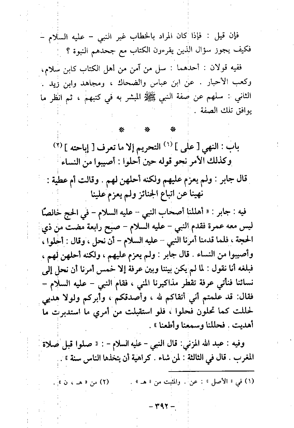 - بَاب النَهْىِ عَلَى التَّحْرِيمِ إِلا مَا تُعْرَفُ إِبَاحَتُهُ وَكَذَلِكَ أَمْرُهُ نَحْوَ قَوْلِهِ: حِينَ أَحَلُّوا: أَصِيبُوا مِنَ النِّسَاءِ