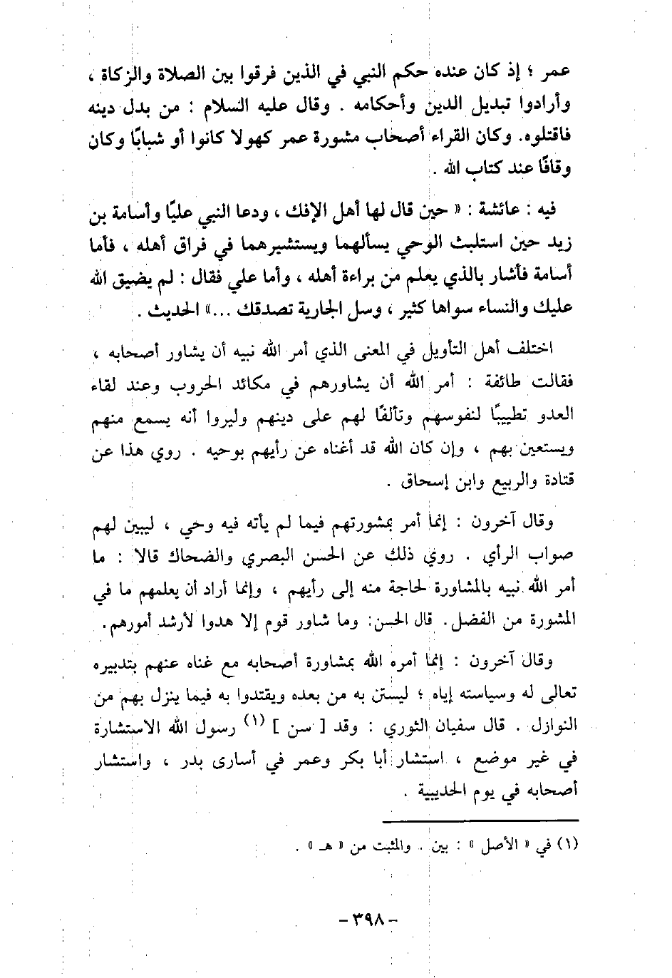 عُمَرَ كُهُولا كَانُوا، أَوْ شُبَّانًا، وَكَانَ وَقَّافًا عِنْدَ كِتَابِ اللَّهِ. / 92 - فيه: عَائِشَةَ، حِينَ قَالَ لَهَا أَهْلُ الإفْكِ مَا قَالُوا، وَدَعَا النَّبِىّ (صلى الله عليه وسلم) عَلِيًا، وَأُسَامَةَ بْنَ زَيْدٍ، حِينَ اسْتَلْبَثَ الْوَحْىُ يَسْأَلُهُمَا، وَيَسْتَشِيرُهُمَا فِى فِرَاقِ أَهْلِهِ، فَأَمَّا أُسَامَةُ فَأَشَارَ بِالَّذِى يَعْلَمُ مِنْ بَرَاءَةِ أَهْلِهِ، وَأَمَّا عَلِىٌّ فَقَالَ: لَمْ يُضَيِّقِ اللَّهُ عَلَيْكَ، وَالنِّسَاءُ سِوَاهَا كَثِيرٌ، وَسَلِ الْجَارِيَةَ تَصْدُقْكَ. . . الحديث. اختلف أهل التأويل فى المعنى الذى أمر الله نبيه أن يشاور أصحابه، فقالت طائفة: أمر الله أن يشاورهم فى مكائد الحروب وعند لقاء العدو تطييبًا لنفوسهم وتألفًا لهم على دينهم وليروا أنه يسمع منهم ويستعين بهم، وإن كان الله قد أغناه عن رأيهم بوحيه. روى هذا عن قتادة والربيع وابن إسحاق. وقال آخرون: إنما أمر بمشورتهم فيما لم يأته فيه وحى، ليبين لهم صواب الرأى. روى ذلك عن الحسن البصرى والضحاك قالا: ما أمر الله نبيه بالمشاورة لحاجة منه إلى رأيهم، وإنما أراد أن يعلمهم ما فى المشورة من الفضل. قال الحسن: وما شاور قوم إلا هدوا لأرشد أمورهم. وقال آخرون: إنما أمره الله بمشاورة أصحابه مع غناه عنهم بتدبيره تعالى له وسياسته إياه؛ ليستن به من بعده ويقتدوا به فيما ينزل بهم من النوازل. قال سفيان الثورى: وقد سن رسول الله الاستشارة فى غير موضع، استشار أبا بكر وعمر فى أسارى بدر، واستشار أصحابه فى يوم الحديبية.