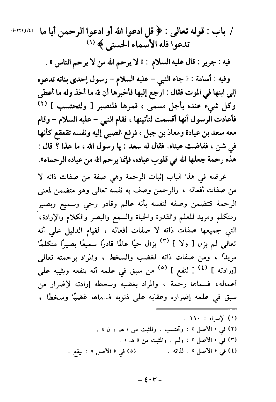 / 5 - فيه: جَرِير، قَالَ (صلى الله عليه وسلم) : (لا يَرْحَمُ اللَّهُ مَنْ لا يَرْحَمُ النَّاسَ) . / 6 - وفيه: أُسَامَة، جَاءَ النَّبِىِّ، النَّبِىّ (صلى الله عليه وسلم) رَسُولُ إِحْدَى بَنَاتِهِ يَدْعُوهُ إِلَى ابْنِهَا فِى الْمَوْتِ، فَقَالَ: (ارْجِعْ إِلَيْهَا، فَأَخْبِرْهَا أَنَّ لِلَّهِ مَا أَخَذَ، وَلَهُ مَا أَعْطَى، وَكُلُّ شَىْءٍ عِنْدَهُ بِأَجَلٍ مُسَمًّى، فَمُرْهَا فَلْتَصْبِرْ وَلْتَحْتَسِبْ) ، فَأَعَادَتِ الرَّسُولَ أَنَّهَا قَدْ أَقْسَمَتْ لَتَأْتِيَنَّهَا، فَقَامَ النَّبِىُّ (صلى الله عليه وسلم) وَقَامَ مَعَهُ سَعْدُ بْنُ عُبَادَةَ، وَمُعَاذُ بْنُ جَبَلٍ، فَدُفِعَ الصَّبِىُّ إِلَيْهِ، وَنَفْسُهُ تَقَعْقَعُ، كَأَنَّهَا فِى شَنٍّ، فَفَاضَتْ عَيْنَاهُ. فَقَالَ لَهُ سَعْدٌ: يَا رَسُولَ اللَّهِ، مَا هَذَا؟ قَالَ: (هَذِهِ رَحْمَةٌ جَعَلَهَا اللَّهُ فِى قُلُوبِ عِبَادِهِ، وَإِنَّمَا يَرْحَمُ اللَّهُ مِنْ عِبَادِهِ الرُّحَمَاءَ) . غرضه فى هذا الباب إثبات الرحمة وهى صفة من صفات ذاته لا من صفات أفعاله، والرحمن وصف به نفسه تعالى وهو متضمن لمعنى الرحمة كتضمن وصفه لنفسه بأنه عالم وقادر وحى وسميع وبصير ومتكلم ومريد للعلم والقدرة والحياة والسمع والبصر والكلام والإرادة، التى جميعها صفات ذاته لا صفات أفعاله، لقيام الدليل على أنه تعالى لم يزل ولا يزال حيًا عالمًا قادرًا سميعًا بصيرًا متكلمًا مريدًا، ومن صفات ذاته الغضب والسخط، والمراد برحمته تعالى إرادته لنفع من سبق فى علمه أنه ينفعه ويثنيه على أعماله، فسماها رحمة، والمراد بغضبه وسخطه إرادته لإضرار من سبق فى علمه إضراره وعقابه على ذنوبه فسماها غضبًا وسخطًا،