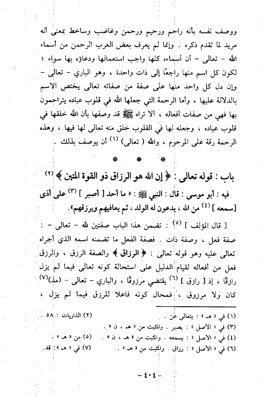 / 7 - فيه: أَبُو مُوسَى، قَالَ النَّبِىُّ (صلى الله عليه وسلم) : (مَا أَحَدٌ أَصْبَرُ عَلَى أَذًى سَمِعَهُ مِنَ اللَّهِ، يَدَّعُونَ لَهُ الْوَلَدَ، ثُمَّ يُعَافِيهِمْ وَيَرْزُقُهُمْ) . قال المؤلف: تضمن هذا الباب صفتين لله تعالى: صفة فعل، وصفة ذات. فصفة الفعل ما تضمنه اسمه الذى أجراه تعالى عليه وهو قوله تعالى: (الرَّزَّاقُ (والصفة الرزق، والرزق فعل من أفعاله لقيام الدليل على استحالة كونه تعالى فيما لم يزل رازقًا، إذ رازق يقتضى مرزوقًا، والبارى تعالى مذ كان ولا مرزوق، فمحال كونه فاعلا للرزق فيما لم يزل،