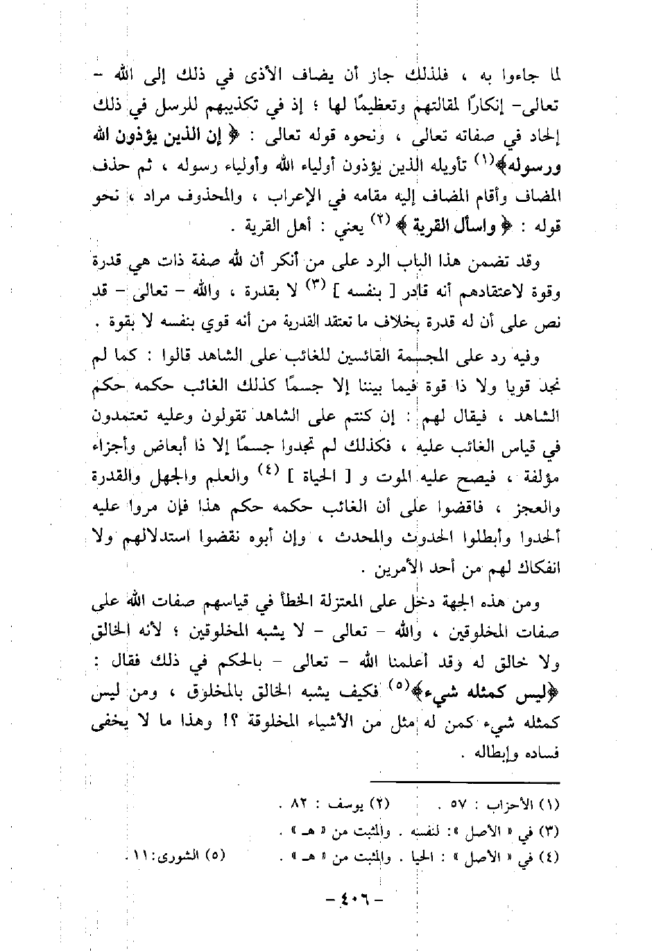لما جاءوا به، فلذلك جاز أن يضاف الأذى فى ذلك إلى الله تعالى إنكارًا لمقالتهم وتعظيمًا لها؛ إذ فى تكذيبهم للرسل فى ذلك إلحاد فى صفاته تعالى، ونحوه قوله تعالى: (إِنَّ الَّذِينَ يُؤْذُونَ اللَّهَ وَرَسُولَهُ) [الأحزاب: 57] ، تأويله الذين يؤذون أولياء الله وأولياء رسوله، ثم حذف المضاف وأقام المضاف إليه مقامه فى الإعراب، والمحذوف مراد، نحو قوله: (وَاسْأَلِ الْقَرْيَةَ) [يوسف: 82] ، يعنى أهل القرية. وقد تضمن هذا الباب الرد على من أنكر أن لله صفة ذات هى قدرة وقوة لاعتقادهم أنه قادر بنفسه لا بقدرة، والله تعالى قد نص على أن له قدرة بخلاف ما تعتقد القدرية من أنه قوى بنفسه لا بقوة. وفيه: رد على المجسمة القائسين للغائب على الشاهد قالوا: كما لم نجد قويا ولا ذا قوة فيما بيننا إلا جسمًا كذلك الغائب حكمه حكم الشاهد، فيقال لهم: إن كنتم على الشاهد تقولون وعليه تعتمدون فى قياس الغائب عليه، فكذلك لم تجدوا جسمًا إلا ذا أبعاض وأجزاء مؤلفة، فيصح عليه الموت والحياة والعلم والجهل والقدرة والعجز، فاقضوا على أن الغائب حكمه حكم هذا فإن مروا عليه ألحدوا وأبطلوا الحدوث والمحدث، وإن أبوه نقضوا استدلالهم ولا انفكاك لهم من أحد الأمرين. ومن هذه الجهة دخل على المعتزلة الخطأ فى قياسهم صفات الله على صفات المخلوقين، والله تعالى لا يشبه المخلوقين؛ لأنه الخالق ولا خالق له وقد أعلمنا الله تعالى بالحكم فى ذلك فقال: (لَيْسَ كَمِثْلِهِ شَىْءٌ) [الشورى: 11] ، فكيف يشبه الخالق بالمخلوق، ومن ليس كمثله شىء كمن له مثل من الأشياء المخلوقة؟ وهذا ما لا يخفى فساده وإبطاله.
