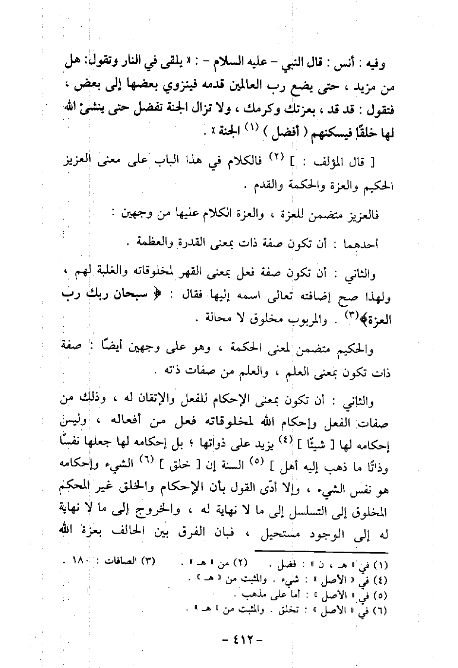 / 14 - وفيه: أَنَس، قَالَ النَّبِىّ (صلى الله عليه وسلم) : (يُلْقَى فِى النَّار) وَتَقُولُ هَلْ مِنْ مَزِيدٍ) [ق: 30] حَتَّى يَضَعَ فِيهَا رَبُّ الْعَالَمِينَ قَدَمَهُ، فَيَنْزَوِى بَعْضُهَا إِلَى بَعْضٍ، فتَقُولُ: قَدْ قَدْ، بِعِزَّتِكَ وَكَرَمِكَ، وَلا تَزَالُ الْجَنَّةُ تَفْضُلُ حَتَّى يُنْشِئَ اللَّهُ لَهَا خَلْقًا، فَيُسْكِنَهُمْ أفَضْلَ الْجَنَّةِ) . قال المؤلف: فالكلام فى هذا الباب على معنى العزيز الحكيم والعزة والحكمة والقدم. أحدهما: أن تكون صفة ذات بمعنى القدرة والعظمة. والثانى: أن تكون صفة فعل بمعنى القهر لمخلوقاته والغلبة لهم، ولهذا صح إضافته تعالى اسمه إليها فقال: (سُبْحَانَ رَبِّكَ رَبِّ الْعِزَّةِ) [الصافات: 180] ، والمربوب مخلوق لا محالة. والحكيم متضمن لمعنى الحكمة، وهو على وجهين أيضًا: صفة ذات تكون بمعنى العلم، والعلم من صفات ذاته. والثانى: أن تكون بمعنى الإحكام للفعل والإتقان له، وذلك من صفات الفعل وإحكام الله لمخلوقاته فعل من أفعاله، وليس إحكامه لها شيئًا يزيد على ذواتها؛ بل إحكامه لها جعلها نفسًا وذاتًا ما ذهب إليه أهل السنة إن خلق الشىء وإحكامه هو نفس الشىء، وإلا أدّى القول بأن الإحكام والخلق غير المحكم المخلوق إلى التسلسل إلى ما لا نهاية له، والخروج إلى ما لا نهاية له إلى الوجود مستحيل، فبان الفرق بين الحالف بعزة الله