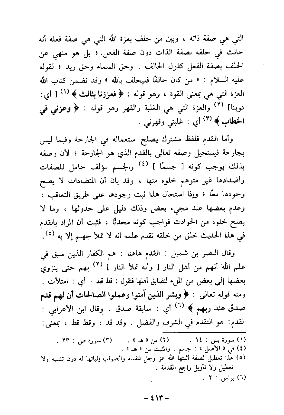 التي هي صفة ذاته، وبين من حلف بعزة الله التي هي صفة فعله أنه حانث فى حلفه بصفة الذات دون صفة الفعل؛ بل هو منهى عن الحلف بصفة الفعل كقول الحالف: وحق السماء وحق زيد؛ لقوله (صلى الله عليه وسلم) : (من كان حالفًا فليحلف بالله) وقد تضمن كتاب الله العزة التى هى بمعنى القوة، وهو قوله: (فَعَزَّزْنَا بِثَالِثٍ) [يس: 14] ، أى قوينا والعزة التى هى الغلبة والقهر وهو قوله: (وَعَزَّنِى فِى الْخِطَابِ) [ص: 23] ، أى غلبنى وقهرنى. وأما القدم فلفظ مشترك يصلح استعماله فى الجارحة وفيما ليس بجارحة فيستحيل وصفه تعالى بالقدم الذى هو الجارحة؛ لأن وصفه بذلك يوجب كونه جسمًا والجسم مؤلف حامل للصفات وأضدادها غير متوهم خلوه منها، وقد بان أن المتضادات لا يصح وجودها معًا، وإذا استحال هذا ثبت وجودها على طريق التعاقب، وعدم بعضها عند مجئ بعض وذلك دليل على حدوثها، وما لا يصح خلوه من الحوادث فواجب كونه محدثًا، فثبت أن المراد بالقدم فى هذا الحديث خلق من خلقه تقدم علمه أنه لا تملأ جهنم إلا به. وقال النضر بن شميل: القدم هاهنا: هم الكفار الذين سبق فى علم الله أنهم من أهل النار وأنه تملأ النار بهم حتى ينزوى بعضها إلى بعض من الملئ لتضايق أهلها فتقول: قط قط، أى امتلأت. ومنه قوله تعالى: (وَبَشِّرِ الَّذِينَ آمَنُوا أَنَّ لَهُمْ قَدَمَ صِدْقٍ عِندَ رَبِّهِمْ) [يونس: 2] ، أى سابقة صدق. وقال ابن الأعرابى: القدم: هو التقدم فى الشرف والفضل. وقد قد، وقط قط، بمعنى: