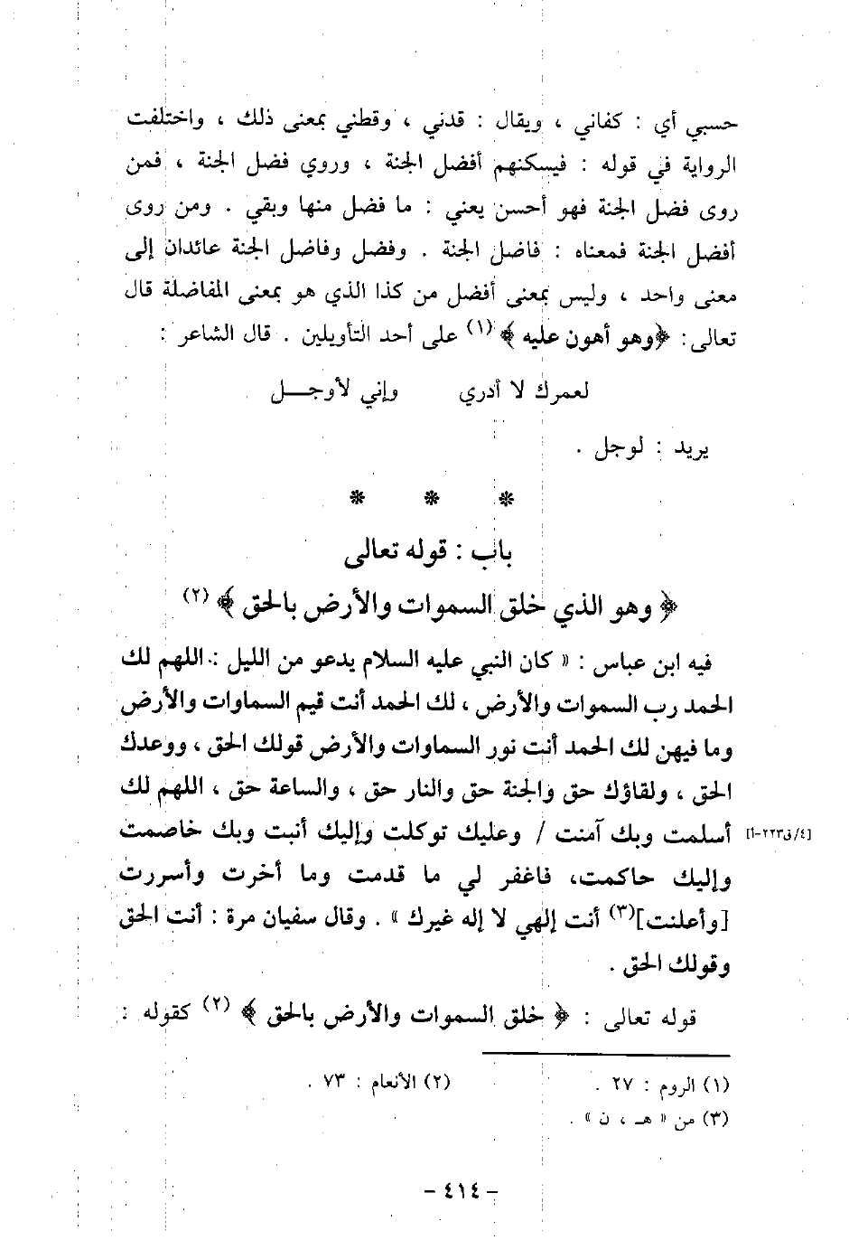 / 15 - فيه: ابْن عَبَّاس، كَانَ النَّبِىُّ (صلى الله عليه وسلم) يَدْعُو مِنَ اللَّيْلِ: (اللَّهُمَّ لَكَ الْحَمْدُ أَنْتَ رَبُّ السَّمَوَاتِ وَالأرْضِ، لَكَ الْحَمْدُ، أَنْتَ قَيِّمُ السَّمَوَاتِ وَالأرْضِ، وَمَنْ فِيهِنَّ، لَكَ الْحَمْدُ أَنْتَ نُورُ السَّمَوَاتِ وَالأرْضِ، قَوْلُكَ الْحَقُّ، وَوَعْدُكَ الْحَقُّ، وَلِقَاؤُكَ حَقٌّ، وَالْجَنَّةُ حَقٌّ، وَالنَّارُ حَقٌّ، وَالسَّاعَةُ حَقٌّ، اللَّهُمَّ لَكَ أَسْلَمْتُ، وَبِكَ آمَنْتُ، وَعَلَيْكَ تَوَكَّلْتُ، وَإِلَيْكَ أَنَبْتُ، وَبِكَ خَاصَمْتُ، وَإِلَيْكَ حَاكَمْتُ، فَاغْفِرْ لِى مَا قَدَّمْتُ، وَمَا أَخَّرْتُ، وَأَسْرَرْتُ، وَأَعْلَنْتُ أَنْتَ إِلَهِى لا إِلَهَ لِى غَيْرُكَ) . وَقَالَ سُفْيَان مرة: أَنْتَ الْحَقُّ، وَقَوْلُكَ الْحَقُّ. قوله تعالى: (خَلَقَ السَّمَاوَاتِ وَالأَرْضَ بِالْحَقِّ) [الأنعام: 73] ، كقوله: