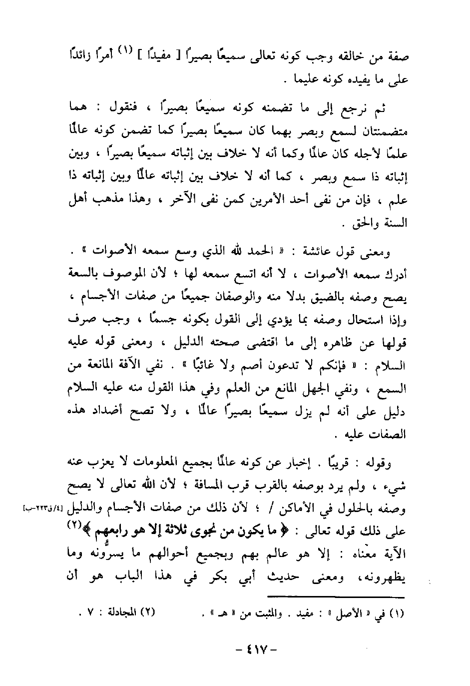 صفة من خالقه وجب كونه تعالى سميعًا بصيرًا مفيدًا أمرًا زائدًا على ما يفيده كونه عليما. ثم نرجع إلى ما تضمنه كونه سميعًا بصيرًا، فنقول: هما منضمنتان لسمع وبصر بهما كان سميعًا بصيرًا كما تضمن كونه عالمًا علمًا لأجله كان عالمًا وكما أنه لا خلاف بين إثباته عالمًا وبين إثباته ذا علم، فإن من نفى أحد الأمرين كمن نفى الآخر، وهذا مذهب أهل السنة والحق. ومعنى قول عائشة: (الحمد لله الذى وسع سمعه الأصوات) . أدرك سمعه الأصوات، لا أنه اتسع سمعه لها؛ لأن الموصوف بالسعة يصح وصفه بالضيق بدلا منه والوصفان جميعًا من صفات الأجسام، وإذا استحال وصفه بما يؤدى إلى القول بكونه جسمًا، وجب صرف قولها عن ظاهره إلى ما اقتضى صحته الدليل، ومعنى قوله (صلى الله عليه وسلم) : (فإنكم لا تدعون أصم ولا غائبًا) . نفى الآفة المانعة من السمع، ونفى الجهل المانع من العلم وفى هذا القول منه (صلى الله عليه وسلم) دليل على أنه لم يزل سميعًا بصيرًا عالمًا، ولا تصح أضداد هذه الصفات عليه. وقوله: قريبًا. إخبار عن كونه عالمًا بجميع المعلومات لا يعزب عنه شىء، ولم يرد بوصفه بالقرب قرب المسافة؛ لأن الله تعالى لا يصح وصفه بالحلول فى الأماكن؛ لأن ذلك من صفات الأجسام والدليل على ذلك قوله تعالى: (مَا يَكُونُ مِن نَّجْوَى ثَلاَثَةٍ إِلاَّ هُوَ رَابِعُهُمْ) [المجادلة: 7] الآية معناه: إلا هو عالم بهم وبجميع أحوالهم ما يسرُّونه وما يظهرونه، ومعنى حديث أبى بكر فى هذا الباب هو أن