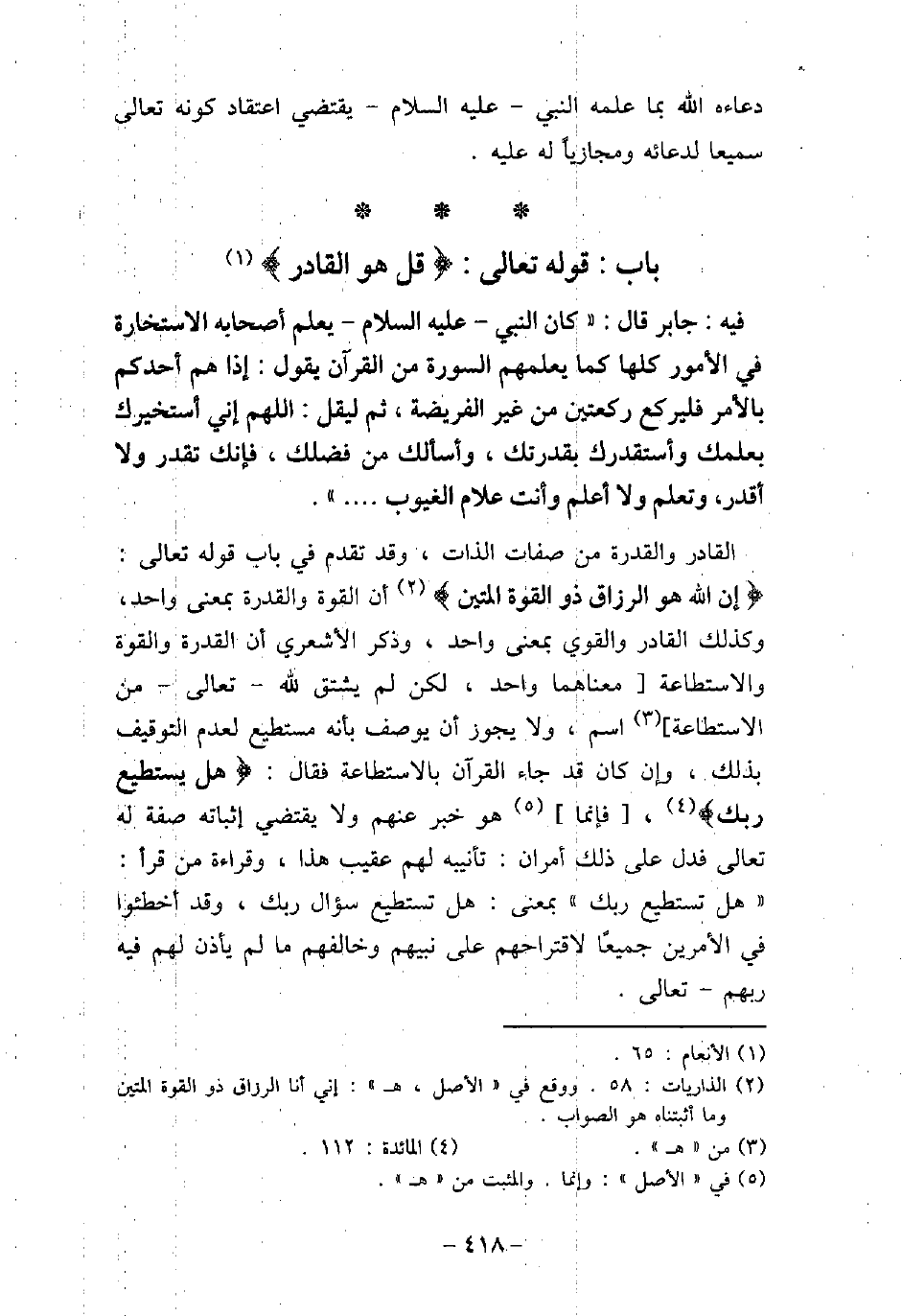 / 19 - فيه: جَابِر، قَالَ: كَانَ النَّبِىّ (صلى الله عليه وسلم) يُعَلِّمُ أَصْحَابَهُ الاسْتِخَارَةَ فِى الأمُورِ كُلِّهَا كَمَا يُعَلِّمُهُمُ السُّورَةَ مِنَ الْقُرْآنِ، يَقُولُ: (إِذَا هَمَّ أَحَدُكُمْ بِالأمْرِ، فَلْيَرْكَعْ رَكْعَتَيْنِ مِنْ غَيْرِ الْفَرِيضَةِ، ثُمَّ لِيَقُلْ: اللَّهُمَّ إِنِّى أَسْتَخِيرُكَ بِعِلْمِكَ، وَأَسْتَقْدِرُكَ بِقُدْرَتِكَ، وَأَسْأَلُكَ مِنْ فَضْلِكَ، فَإِنَّكَ تَقْدِرُ، وَلا أَقْدِرُ وَتَعْلَمُ، وَلا أَعْلَمُ وَأَنْتَ عَلامُ الْغُيُوبِ. . .) . القادر والقدرة من صفات الذات، وقد تقدم فى باب قوله تعالى: (إِنَّ اللَّهَ هُوَ الرَّزَّاقُ ذُو الْقُوَّةِ الْمَتِينُ) [الذاريات: 58] ، أن القوة والقدرة بمعنى واحد، وكذلك القادر والقوى بمعنى واحد، وذكر الأشعرى أن القدرة والقوة والاستطاعة معناها واحد، لكن لم يشتق لله تعالى من الاستطاعة اسم، ولا يجوز أن يوصف بأنه مستطيع لعدم التوقيف بذلك، وإن كان قد جاء القرآن بالاستطاعة فقال: (هَلْ يَسْتَطِيعُ رَبُّكَ) [المائدة: 112] ، فإنما هو خبر عنهم ولا يقتضى إثباته صفة له تعالى فدل على ذلك أمران: تأنيبه لهم عقيب هذا، وقراءة من قرأ: (هل تستطيع ربك) بمعنى: هل تسطيع ربك، وقد أخطئوا فى الأمرين جميعًا لاقتراحهم على نبيهم وخالقه ما لم يأذن لهم فيه ربهم تعالى.