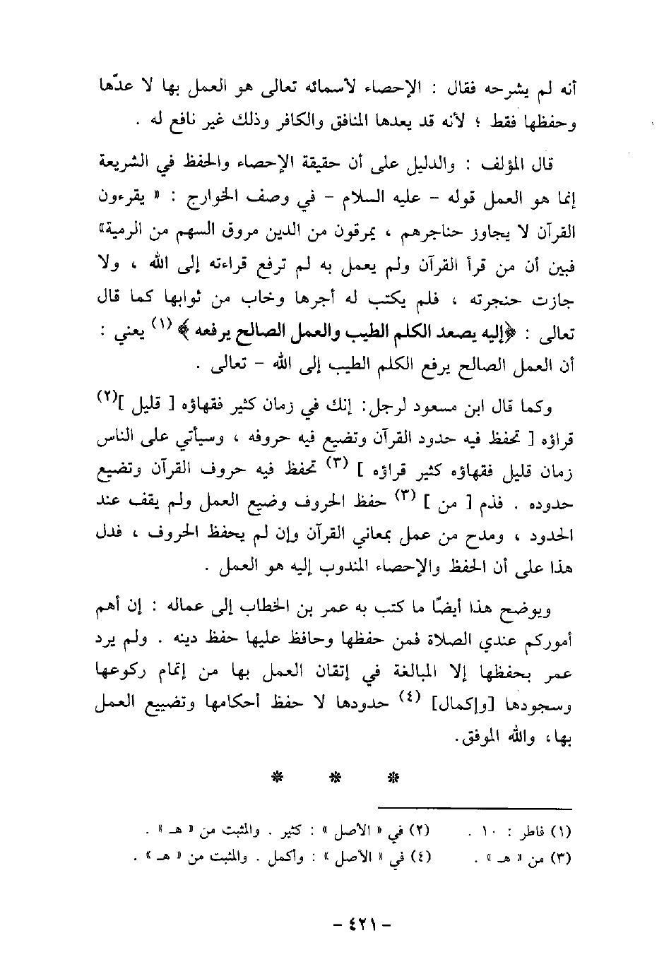 أنه لم يشرحه فقال: الإحصاء لأسمائه تعالى هو العمل بها لا عدّها وحفظها فقط؛ لأنه قد يعدها المنافق والكافر وذلك غير نافع له. قال المؤلف: والدليل على أن حقيقة الإحصاء والحفظ فى الشريعة إنما هو العمل قوله (صلى الله عليه وسلم) فى وصف الخوارج: (يقرءون القرآن لا يجاوز حناجرهم، يمرقون من الدين مروق السهم من الرمية) فبين أن من قرأ القرآن ولم يعمل به لم ترفع قراءته إلى الله، ولا جازت حنجرته، فلم يكتب له أجرها وخاب من ثوابها كما قال تعالى: (إِلَيْهِ يَصْعَدُ الْكَلِمُ الطَّيِّبُ وَالْعَمَلُ الصَّالِحُ يَرْفَعُهُ) [فاطر: 10] ، يعنى أن العمل الصالح يرفع الكلم الطيب إلى الله تعالى. وكما قال ابن مسعود لرجل: إنك فى زمان كثير فقهاؤه قليل قراؤه تحفظ فيه حدود القرآن وتضيع فيه حروفه، وسيأتى على الناس زمان قليل فقهاؤه كثير قراؤه تحفظ فيه حروف القرآن وتضيع حدوده. فذم من حفظ الحروف وضيع العمل ولم يقف عند الحدود، ومدح من عمل بمعانى القرآن وإن لم يحفظ الحروف، فدل هذا على أن الحفظ والإحصاء المندوب إليه هو العمل. ويوضح هذا أيضًا ما كتب به عمر بن الخطاب إلى عماله: إن أهم أموركم عندى الصلاة فمن حفظها وحافظ عليها دينه. ولم يرد عمر بحفظها إلا المبالغة فى إتقان العمل بها من إتمام ركوعها وسجودها وإكمال حدودها لا حفظ أحكامها وتضييع العمل بها، والله الموفق.