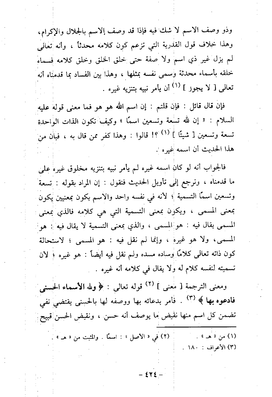 وذو وصف الاسم لا شك فيه فإذا قد وصف الاسم بالجلال والإكرام، وهذا خلاف قول القدرية التى تزعم كون كلامه محدثًا، وأنه تعالى لم يزل غير ذى اسم ولا صفة حتى خلق الخلق وخلق كلامه فسماه خلقه بأسماء محدثة وسمى نفسه بمثلها، وهذا بين الفساد بما قدمناه أنه تعالى لا يجوز أن يأمر نبيه بتنزيه غيره. فإن قال قائل: فإن قلتم: إن اسم الله هو هو فما معنى قوله (صلى الله عليه وسلم) : (إن لله تسعة وتسعين اسمًا) وكيف تكون الذات الواحدة تسعة وتسعون شيئًا؟ قالوا: وهذا كفر ممن قال به، فبان من هذا الحديث أن اسمه غيره. فالجواب: أنه لو كان اسمه غيره لم يأمر نبيه بتنزيه مخلوق غيره على ما قدمناه، ونرجع إلى تأويل الحديث فنقول: إن المراد بقوله: تسعة وتسعين اسمًا التسمية؛ لأنه فى نفسه واحد والاسم يكون بمعنيين يكون بمعنى المسمى، ويكون بمعنى التسمية التى هى كلامه فالذى بمعنى المسمى يقال فيه: هو المسمى، والذى بمعنى التسمية لا يقال فيه: هو المسمى، ولا هو غيره، وإنما لم نقل فيه أيضًا: هو غيره؛ لأن تسميته لنفسه كلام له ولا يقال فى كلامه أنه غيره. ومعنى الترجمة معنى قوله تعالى: (وَلِلّهِ الأَسْمَاء الْحُسْنَى فَادْعُوهُ بِهَا) [الأعراف: 180] ، فأمر بدعائه بها ووصفه لها بالحسنى يقتضى نفى تضمن كل اسم منها نقيض ما يوصف أنه حسن، ونقيض الحسن قبيح
