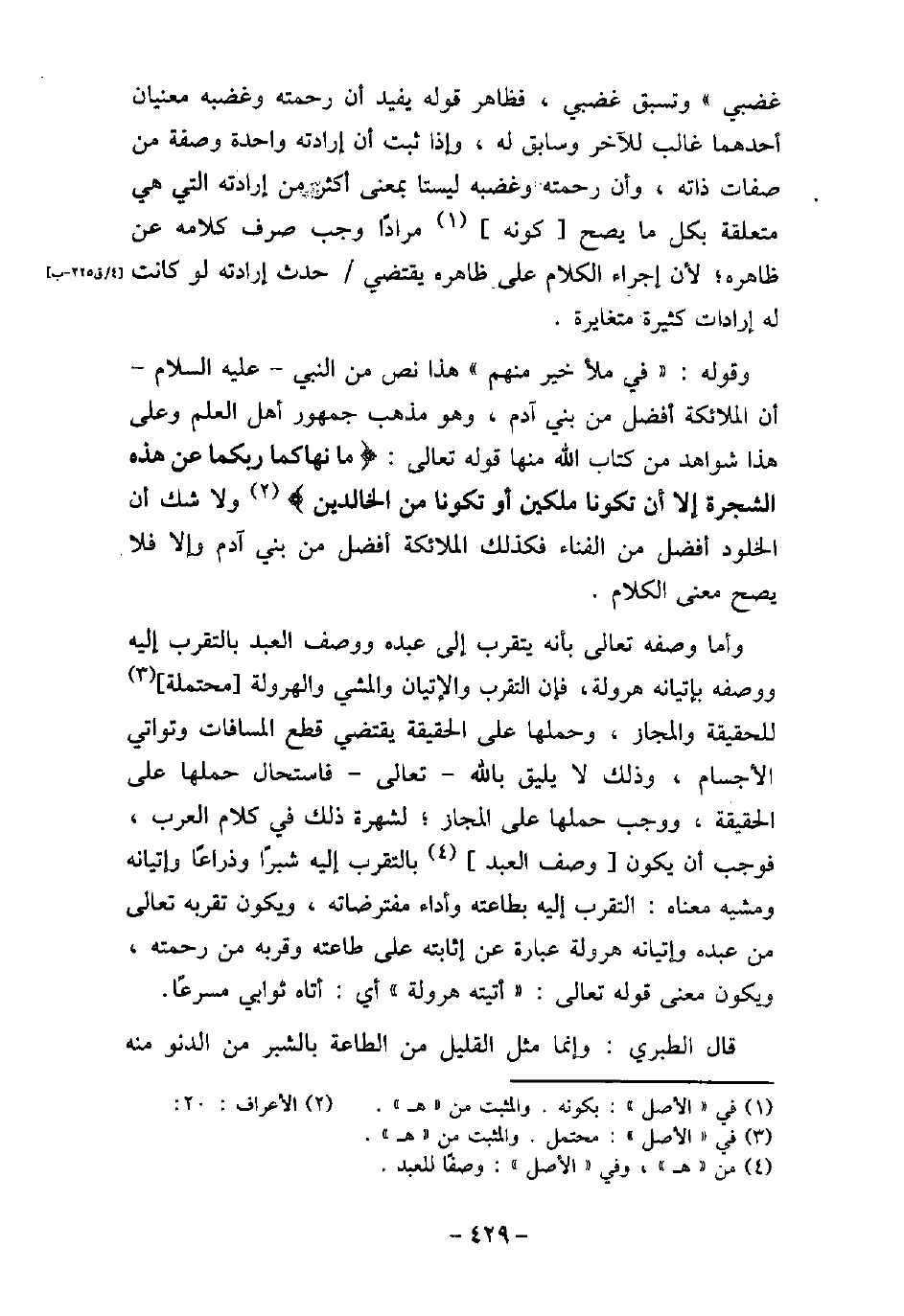 غضبي) . فقد تقدم أن رحمته تعالى إرادته لإثابة المطيعين له وغضبه لعقاب العاصين له، وإذا كان ذلك كذلك كان معنى قوله: (إن رحمتى تغلب غضبى) إن إرادتى ثواب الطائعين لى هى إرادتى ألا أعذبهم. وهو معنى قوله تعالى: (يُرِيدُ اللهُ بِكُمُ الْيُسْرَ وَلاَ يُرِيدُ بِكُمُ الْعُسْرَ) [البقرة: 185] ، فإرادته بهم اليسر هى إرادته ألا يريد بهم العسر، وما كان ما أراد من ذلك بهم، ولم يكن ما لم يرده فعبر (صلى الله عليه وسلم) عن هذا المعنى بقوله: (إن رحمتى تغب غضبى) وتسبق غضبى، فظاهر قوله يفيد أن رحمته وغضبه معنيان أحدهما غالب للآخر وسابق له، وإذا ثبت أن إرادته واحدة وصفة من صفات ذاته، وأن رحمته وغضبه ليستا بمعنى أكثر من إرادته التى هى متعلقة بكل ما يصح لأكونه مرادًا وجب صرف كلامه عن ظاهره؛ لأن إجراء الكلام على ظاهره يقتضى حدث إرادته لو كانت له إرادات كثيرة متغايرة. وقوله: (فى ملأ خير منهم) هذا نص من النبى (صلى الله عليه وسلم) أن الملائكة أفضل من بنى آدم، وهو مذهب جمهور أهل العلم وعلى هذا شواهد من كتاب الله منها قوله تعالى: (مَا نَهَاكُمَا رَبُّكُمَا عَنْ هَذِهِ الشَّجَرَةِ إِلاَّ أَن تَكُونَا مَلَكَيْنِ أَوْ تَكُونَا مِنَ الْخَالِدِينَ) [الأعراف: 20] ، ولا شك أن الخلود أفضل من الفناء فكذلك الملائكة أفضل من بنى آدم وإلا فلا يصح معنى الكلام. وأما وصفه تعالى بأنه يتقرب إلى عبده ووصفه بالتقرب إليه ووصفه بإتيانه هرولة، فإن التقرب والإتيان والمشى والهرولة محتملة للحقيقة والمجاز، وحملها على الحقيقة يقتضى قطع المسافات وتواتى الأجسام، وذلك لا يليق بالله تعالى فاستحال حملها على الحقيقة، ووجب حملها على المجاز؛ لشهرة ذلك فى كلام العرب، فوجب أن يكون وصف العبد بالتقرب إليه شبرًا وذراعًا وإتيانه ومشيه معناه: التقرب إليه بطاعته وأداء مفترضاته، ويكون تقربه تعالى من عبده قوله تعالى: (أتيته هرولة) أى: أتاه ثوابى مسرعًا. قال الطبرى: وإنما مثل القليل من الطاعة بالشبر من الدنو منه