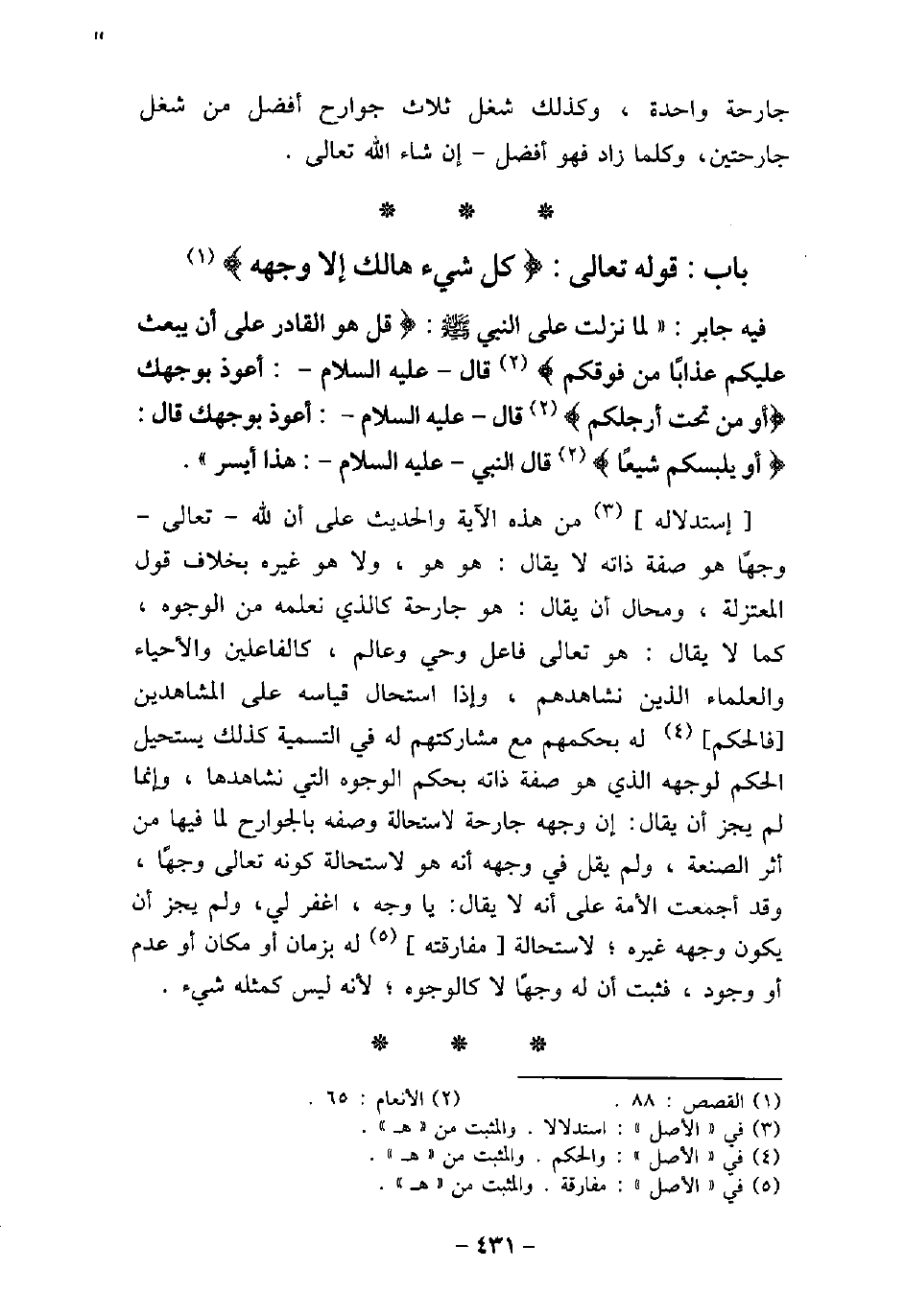 / 34 - فيه: جَابِر، لَمَّا نَزَلَتْ على النَّبِىّ (صلى الله عليه وسلم) : (قُلْ هُوَ الْقَادِرُ عَلَى أَنْ يَبْعَثَ عَلَيْكُمْ عَذَابًا مِنْ فَوْقِكُمْ) [الأنعام: 65] ، قَالَ (صلى الله عليه وسلم) : (أَعُوذُ بِوَجْهِكَ) ، فَقَالَ: (أَوْ مِنْ تَحْتِ أَرْجُلِكُمْ (، قَالَ عليه السّلام: (أَعُوذُ بِوَجْهِكَ) ، قَالَ: (أَوْ يَلْبِسَكُمْ شِيَعًا (، قَالَ النَّبِىُّ (صلى الله عليه وسلم) : (هَذَا أَيْسَرُ) . استدلاله من هذه الآية والحديث على أن لله تعالى وجهًا هو صفة ذاته لا يقال: هو هو، ولا هو غيره بخلاف قول المعتزلة، ومحال أن يقال: هو جارحة كالذى نعلمه من الوجوه، كما لا يقال: هو تعالى فاعل وحى وعالم، كالفاعلين والأحياء والعلماء الذين نشاهدهم، وإذا استحال قياسه على المشاهدين فالحكم له بحكمهم مع مشاركتهم له فى التسمية كذلك يستحيل الحكم لوجهه الذى هو صفة ذاته بحكم الوجوه التى نشاهدها، وإنما لم يجز أن يقال: إن وجهه جارحة لاستحالة وصفه بالجوارح لما فيها من أثر الصنعة، ولم يقل فى وجهه أنه هو لاستحالة كونه تعالى وجهًا، وقد أجمعت الأمة على أنه لا يقال: يا وجه، اغفر لى، ولم يجز أن يكون وجهه غيره؛ لاستحالة مفارقته له بزمان أو مكان أو عدم أو وجود، فثبت أن له وجهًا لا كالوجوه؛ لأنه ليس كمثله شىء.