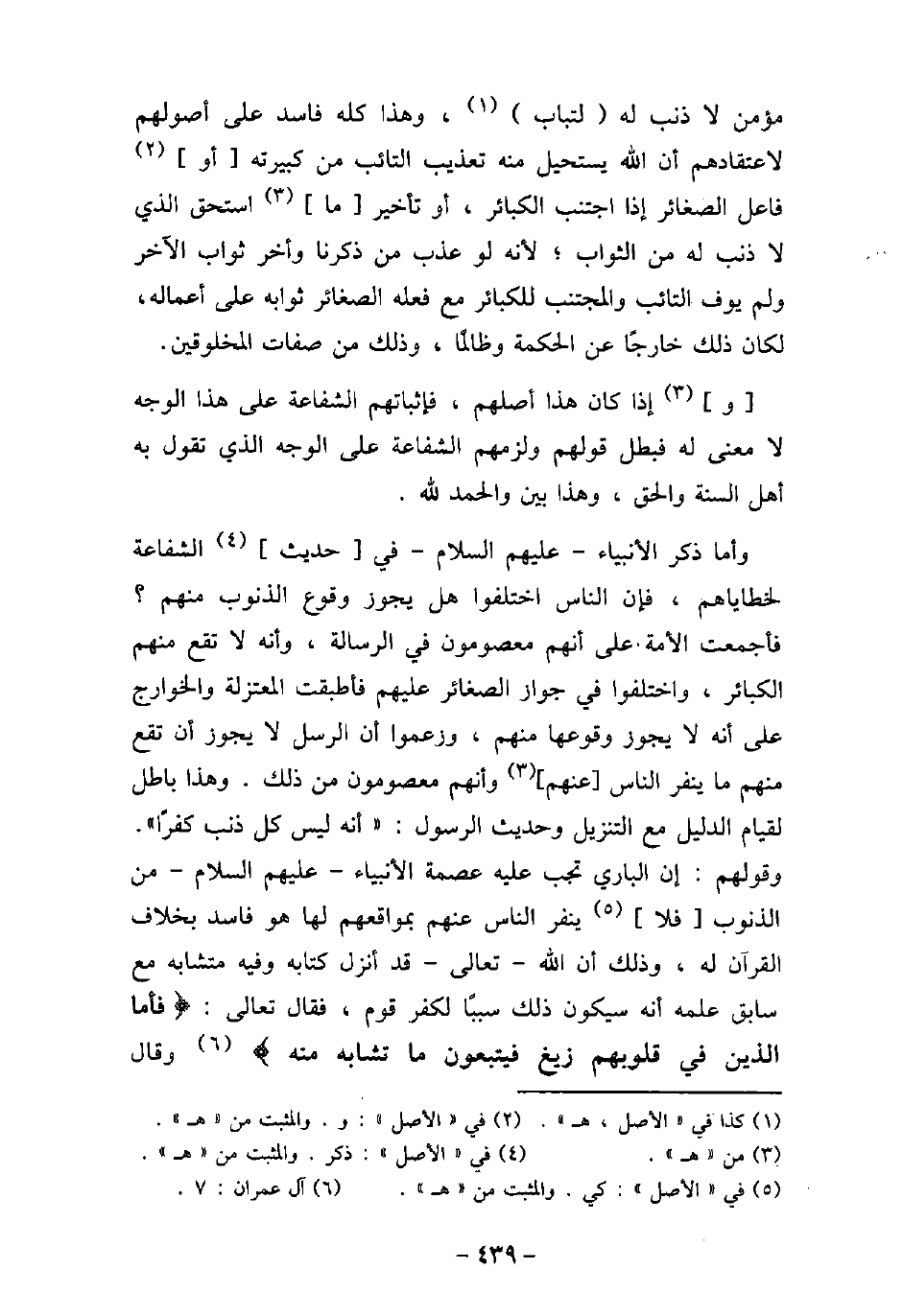 مؤمن لا ذنب له لتائب، وهذا كله فاسد على أصولهم لاعتقادهم أن الله يستحيل منه تعذيب التائب من كبيرته أو فاعل الصغائر إذا اجتنب الكبائر، أو تأخير ما استحق الذى لا ذنب له من الثواب؛ لأنه لو عذب من ذكرنا وأخر ثواب الآخر ولم يوف التائب والمجتنب للكبائر مع فعله الصغائر ثوابه على أعماله، لكان ذلك خارجًا عن الحكمة وظالمًا، وذلك من صفات المخلوقين. وإذا كان هذا أصلهم، فإثباتهم الشفاعة على هذا الوجه لا معنى له فبطل قولهم ولزمهم الشفاعة على الوجه الذى تقول به أهل السنة والحق، وهذا بين والحمد لله. وذكر الأنبياء (صلى الله عليه وسلم) فى حديث الشفاعة لخطاياهم، فإن الناس اختلفوا هل يجوز وقوع الذنوب منهم؟ فأجمعت الأمة على أنهم معصومون فى الرسالة، وأنه لا تقع منهم الكبائر، واختلفوا فى جواز الصغائر عليهم فأطبقت المعتزلة والخوارج على أنه لا يجوز وقوعها منهم، وزعموا أن الرسل لا يجوز أن تقع منهم ما ينفر الناس عنهم وأنهم معصومون من ذلك. وهذا باطل لقيام الدليل مع التنزيل وحديث الرسول: (أنه ليس كل ذنب كفرًا) . وقولهم: إن البارى تجب عليه عصمة الأنبياء، عليهم السلام، من الذنوب فلا ينفر الناس عنهم بمواقعهم لها هو فاسد بخلاف القرآن له، وذلك أن الله تعالى قد أنزل كتابه وفيه متشابه مع سابق علمه أنه سيكون ذلك سببًا لكفر قوم، فقال تعالى: (فَأَمَّا الَّذِينَ فى قُلُوبِهِمْ زَيْغٌ فَيَتَّبِعُونَ مَا تَشَابَهَ مِنْهُ) [آل عمران: 7] ، وقال