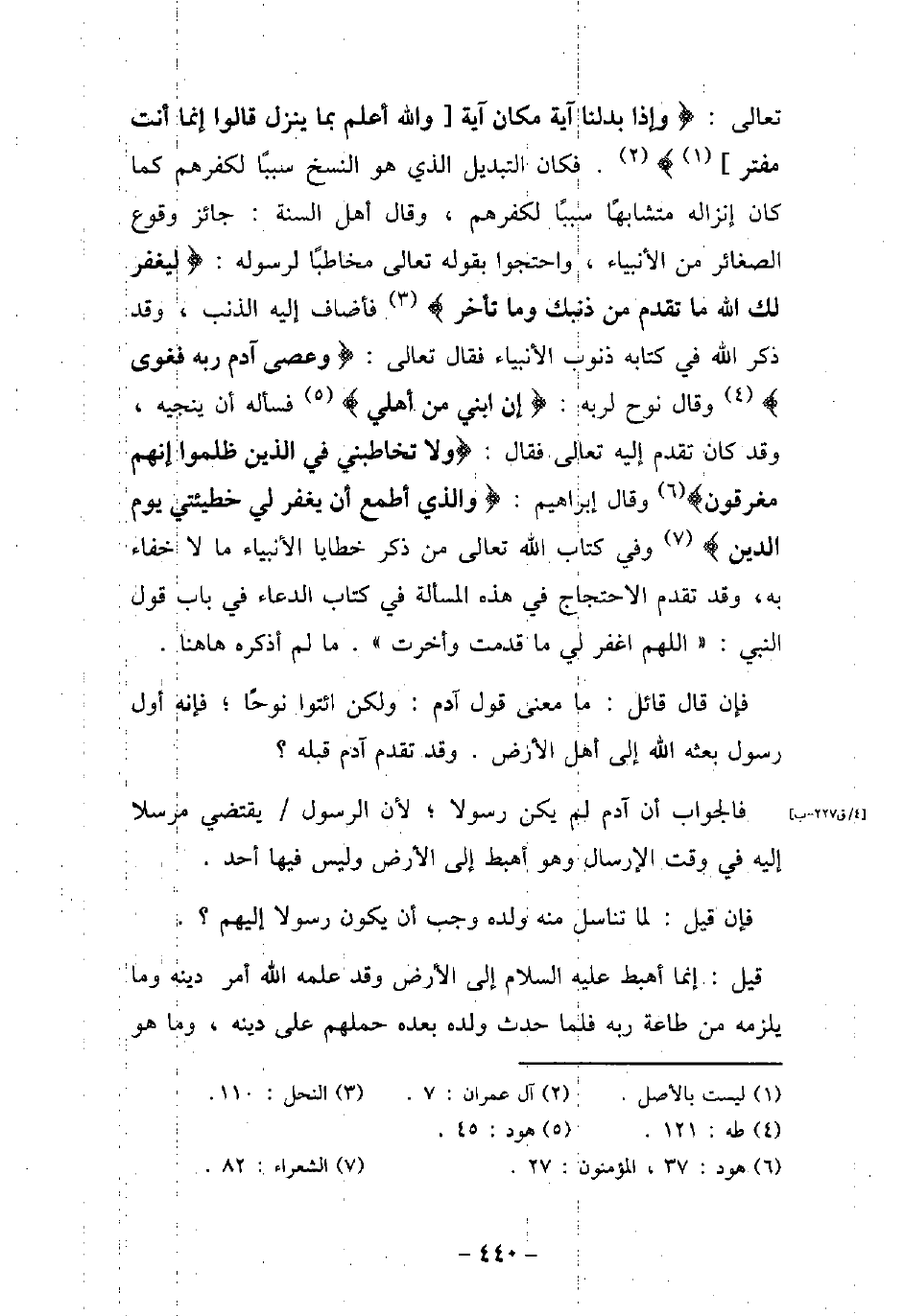 تعالى: (وَإِذَا بَدَّلْنَا آيَةً مَّكَانَ آيَةٍ وَاللهُ أَعْلَمُ بِمَا يُنَزِّلُ قَالُوا إِنَّمَا أَنتَ مُفْتَرٍ) [النحل: 101] فكان التبديل الذى هو النسخ سببًا لكفرهم كما كان إنزاله متشابهًا سببًا لكفرهم، وقال أهل السنة: جائز وقوع الصغائر من الأنبياء، واحتجوا بقوله تعالى مخاطبًا لرسوله: (لِيَغْفِرَ لَكَ اللَّهُ مَا تَقَدَّمَ مِن ذَنبِكَ وَمَا تَأَخَّرَ) [الفتح: 2] فأضاف إليه الذنب، وقد ذكر الله فى كتابه ذنوب الأنبياء فقال تعالى: (وَعَصَى آدَمُ رَبَّهُ فَغَوَى) [طه: 121] ، وقال نوح لربه: (إِنَّ ابُنِى مِنْ أَهْلِى) [هود: 45] ، فسأله أن ينجيه، وقد كان تقدم إليه تعالى فقال: (وَلاَ تُخَاطِبْنِى فِى الَّذِينَ ظَلَمُوا إِنَّهُم مُّغْرَقُونَ) [هود: 37] ، وقال إبراهيم: (وَالَّذِى أَطْمَعُ أَن يَغْفِرَ لِى خَطِيئَتِى يَوْمَ الدِّينِ) [الشعراء: 82] ، وفى كتاب الله تعالى من ذكر خطايا الأنبياء ما لا خفاء به، وقد تقدم الاحتجاج فى هذه المسألة فى كتاب الدعاء فى باب قول النبى: (أللهم اغفر لى ما تقدم وتأخر) ما لم أذكره هاهنا. فإن قال قائل: ما معنى قول آدم: ولكن ائتوا نوحًا؛ فإنه أول رسول بعثه الله إلى أهل الأرض. وقد تقدم آدم قبله؟ فالجواب: أن آدم لم يكن رسولا؛ لأن الرسول يقتضى مرسلا إليه فى وقت الإرسال وهو أهبط إلى الأرض وليس فيها أحد. فإن قيل: لما تناسل منه ولده وجب أن يكون رسولا إليهم؟ قيل: إنما أهبط (صلى الله عليه وسلم) إلى الأرض وقد علمه الله أمر دينه وما يلزمه من طاعة ربه فلما حدث ولده بعده حملهم على دينه، وما هو