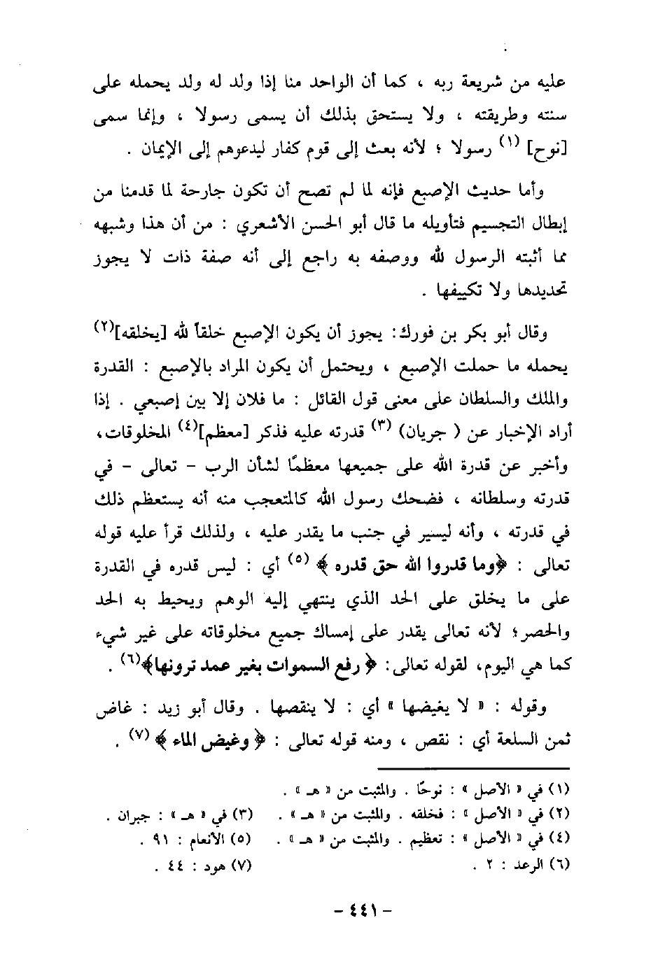 عليه من شريعة ربه، كما أن الواحد منا إذا ولد له ولد يحمله على سنته وطريقته، ولا يستحق بذلك أن يسمى رسولا، وإنما سمى نوح رسولا؛ لأنه بعث إلى قوم كفار ليدعهم إلى الإيمان. وأما حديث الإصبع فإنه لما لم تصح أن تكون جارحة لما قدمنا من إبطال التجسيم فتأويله ما قال أبو الحسن الأشعرى: من أن هذا وشبهه مما أثبته الرسول لله ووصفه به راجع إلى أنه صفة ذات لا يجوز تحديدها ولا تكييفها. وقال أبو بكر بن فورك: يجوز أن يكون الإصبع خلقًا لله يخلقه يحمله ما حملت الإصبع، ويحتمل أن يكون المراد بالإصبع: إذا أراد الإخبار عن جريان قدرته عليه فذكر معظم المخلوقات، وأخبر عن قدرة الله على جميعها معظمًا لشأن الرب تعالى فى قدرته وسلطانه، فضحك رسول الله كالمتعجب منه أنه يستعظم ذلك فى قدرته، وأنه ليسير فى جنب ما يقدر عليه، ولذلك قرأ عليه قوله تعالى: (وَمَا قَدَرُوا اللهَ حَقَّ قَدْرِهِ) [الأنعام: 91] ، أى ليس قدره فى القدرة على ما يخلق على الحد الذى ينتهى إليه الوهم ويحيط به الحد والحصر؛ لأنه تعالى يقدر على إمساك جميع مخلوقاته على غير شىء كما هى اليوم، لقوله تعالى: (رَفَعَ السَّمَاوَاتِ بِغَيْرِ عَمَدٍ تَرَوْنَهَا) [الرعد: 2] . وقوله: (لا يغيضها) أى: لا ينقصها. وقال أبو زيد: غاض ثمن السلعة أى: نقص، ومنه قوله تعالى: (وَغِيضَ الْمَاء) [هود: 44] .