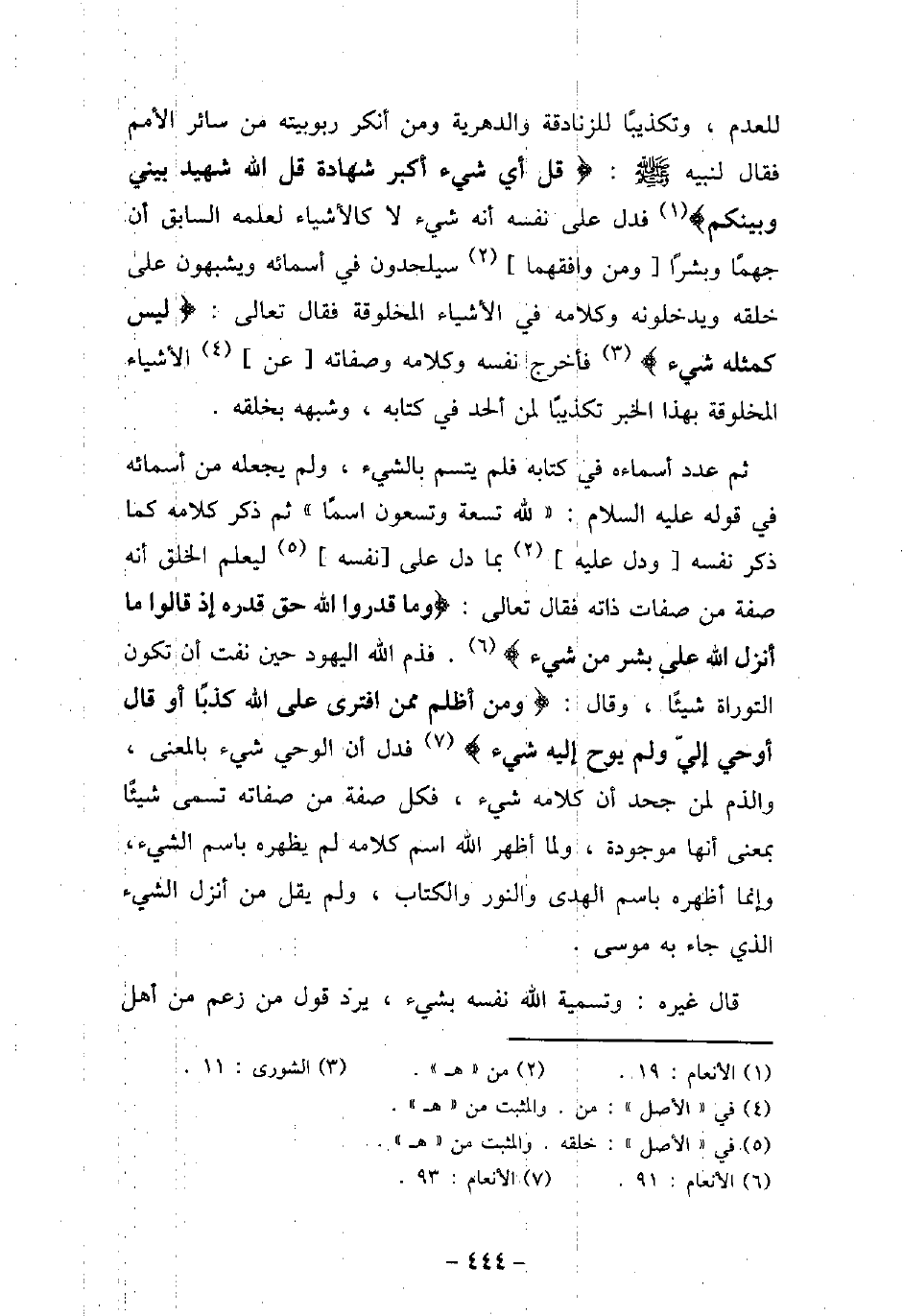 للعدم، وكذلك أجرى على كلامه ما أجراه على نفسه فلم يتسم بالشئ ولم يجعل الشىء من أسمائه، ولكنه دل على نفسه أنه شىء أكبر الأشياء، إثباتًا للوجود ونفيًا للعدم، وتكذيبًا للزنادقة والدهرية ومن أنكر ربوبيته من سائر الأمم فقال لنبيه (صلى الله عليه وسلم) : (قُلْ أَىُّ شَىْءٍ أَكْبَرُ شَهَادةً قُلِ اللهِ شَهِيدٌ بِيْنِى وَبَيْنَكُمْ) [الأنعام: 19] ، فدل على نفسه أنه شىء لا كالأشياء لعلمه السابق أن جهمًا وبشرًا ومن وافقهما سيلحدون فى أسمائه ويشبهون على خلقه ويدخلونه وكلامه فى الأشياء المخلوقة فقال تعالى: (لَيْسَ كَمِثْلِهِ شَىْءٌ) [الشورى: 11] ، فأخرج نفسه وكلامه وصفاته عن الأشياء المخلوقة بهذا الخبر تكذيبًا لمن ألحد فى كتابه، وشبهه بخلقه. ثم عدد أسماءه فى كتابه فلم يتسم بالشىء، ولم يجعله من أسمائه فى قوله (صلى الله عليه وسلم) : (لله تسعة وتسعون اسمًا) ثم ذكر كلامه كما ذكر نفسه ودل عليه بما دل على نفسه ليعلم الخلق أنه صفة من صفات ذاته فقال تعالى: (وَمَا قَدَرُوا اللهَ حَقَّ قَدْرِهِ إِذْ قَالُوا مَا أَنزَلَ اللهُ عَلَى بَشَرٍ مِّن شَىْءٍ) [الأنعام: 91] ، فذم الله اليهود حين نفت أن تكون التوراة شيئًا، وقال: (وَمَنْ أَظْلَمُ مِمَّنِ افْتَرَى عَلَى اللهِ كَذِبًا أَوْ قَالَ أُوْحِىَ إِلَىَّ وَلَمْ يُوحَ إِلَيْهِ شَىْءٌ) [الأنعام: 93] ، فدل أن الوحى شىء بالمعنى، والذم لمن جحد أن كلامه شىء، فكل صفة من صفاته باسم الشىء، وإنما أظهره باسم الهدى والنور والكتاب، ولم يقل من أنزل الشىء الذى جاء به موسى. قال غيره: وتسمية الله نفسه بشىء، يرد قول من زعم من أهل