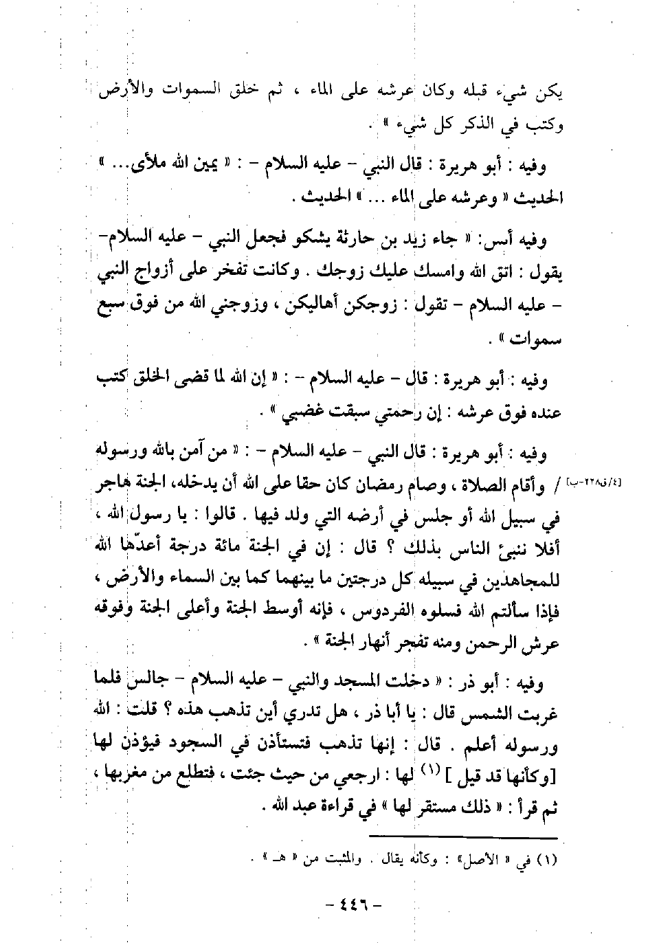 يَكُنْ شَىْءٌ قَبْلَهُ، وَكَانَ عَرْشُهُ عَلَى الْمَاءِ، ثُمَّ خَلَقَ السَّمَوَاتِ وَالأرْضَ، وَكَتَبَ فِى الذِّكْرِ كُلَّ شَىْءٍ) . / 47 - وفيه: أَبُو هُرَيْرَةَ، قَالَ النَّبِىّ (صلى الله عليه وسلم) : (يَمِينَ اللَّهِ مَلأى. . .) الحديث (وَعَرْشُهُ عَلَى الْمَاءِ. . .) الحديث. / 48 - وفيه: أَنَس، جَاءَ زَيْدُ بْنُ حَارِثَةَ يَشْكُو، فَجَعَلَ النَّبِىُّ (صلى الله عليه وسلم) يَقُولُ: (اتَّقِ اللَّهَ، وَأَمْسِكْ عَلَيْكَ زَوْجَكَ) ، وَكَانَتْ تَفْخَرُ عَلَى أَزْوَاجِ النَّبِىِّ (صلى الله عليه وسلم) تَقُولُ: زَوَّجَكُنَّ أَهَالِيكُنَّ، وَزَوَّجَنِى اللَّهُ مِنْ فَوْقِ سَبْعِ سَمَوَاتٍ. / 49 - وفيه: أَبُو هُرَيْرَةَ، قَالَ (صلى الله عليه وسلم) : (إِنَّ اللَّهَ لَمَّا قَضَى الْخَلْقَ كَتَبَ عِنْدَهُ فَوْقَ عَرْشِهِ: إِنَّ رَحْمَتِى سَبَقَتْ غَضَبِى) . / 50 - وفيه: أَبُو هُرَيْرَةَ، قَالَ النَّبِىّ (صلى الله عليه وسلم) : (مَنْ آمَنَ بِاللَّهِ وَرَسُولِهِ، وَأَقَامَ الصَّلاةَ، وَصَامَ رَمَضَانَ، كَانَ حَقًّا عَلَى اللَّهِ أَنْ يُدْخِلَهُ الْجَنَّةَ، هَاجَرَ فِى سَبِيلِ اللَّهِ، أَوْ جَلَسَ فِى أَرْضِهِ الَّتِى وُلِدَ فِيهَا) ، قَالُوا: يَا رَسُولَ اللَّهِ، أَفَلا نُنَبِّئُ النَّاسَ بِذَلِكَ، قَالَ: (إِنَّ فِى الْجَنَّةِ مِائَةَ دَرَجَةٍ، أَعَدَّهَا اللَّهُ لِلْمُجَاهِدِينَ فِى سَبِيلِهِ، كُلُّ دَرَجَتَيْنِ مَا بَيْنَهُمَا كَمَا بَيْنَ السَّمَاءِ وَالأرْضِ، فَإِذَا سَأَلْتُمُ اللَّهَ فَسَلُوهُ الْفِرْدَوْسَ، فَإِنَّهُ أَوْسَطُ الْجَنَّةِ وَأَعْلَى الْجَنَّةِ وَفَوْقَهُ عَرْشُ الرَّحْمَنِ وَمِنْهُ تَفَجَّرُ أَنْهَارُ الْجَنَّةِ) . / 51 - وفيه: أَبُو ذَرّ، دَخَلْتُ الْمَسْجِدَ وَالنَّبِىّ (صلى الله عليه وسلم) جَالِسٌ، فَلَمَّا غَرَبَتِ الشَّمْسُ، قَالَ: (يَا أَبَا ذَرٍّ، هَلْ تَدْرِى أَيْنَ تَذْهَبُ هَذِهِ) ؟ قُلْتُ: اللَّهُ وَرَسُولُهُ أَعْلَمُ، قَالَ: (إِنَّهَا تَذْهَبُ تَسْتَأْذِنُ فِى السُّجُودِ، يُؤْذَنُ لَهَا، وَكَأَنَّهَا قَدْ قِيلَ لَهَا: ارْجِعِى مِنْ حَيْثُ جِئْتِ، فَتَطْلُعُ مِنْ مَغْرِبِهَا) ، ثُمَّ قَرَأَ: (ذَلِكَ مُسْتَقَرٌّ لَهَا (فِى قِرَاءةِ عَبْدِاللَّهِ.