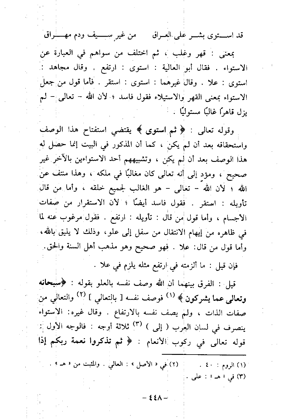 بمعنى: قهر وغلب، ثم اختلف من سواهم فى العبارة عن الاستواء. فقال أبو العالية: استوى: ارتفع. وقال مجاهد: استوى: علا. وقال غيرهما: استوى: استقر. فأما قول من جعل الاستواء بمعنى القهر والاستيلاء فقول فاسد؛ لأن الله تعالى لم يزل قاهرًا غالبًا مستوليًا. وقوله تعالى: (ثُمَّ اسْتَوَى (يقتضى استفتاح هذا الوصف واستحقاقه بعد أن لم يكن، كما أن المذكور فى البيت إنما حصل له هذا الوصف بعد أن لم يكن، وتشبيههم أحد الاستواءين بالآخر غير صحيح، ومؤد إلى أنه تعالى كان مغالبًا فى ملكه، وهذا منتف عن الله؛ لأن الله تعالى هو الغالب لجميع خلقه، وأما من قال تأويله: استقر. فقول فاسد أيضًا؛ لأن الاستقرار من صفات الأجسام، وأما قول من قال: تأويله: ارتفع. فنقول مرغوب عنه لما فى ظاهره من إيهام الانتقال من سفل إلى علو، وذلك لا يليق بالله، وأما قول من قال: علا. فهو صحيح وهو مذهب أهل السنة والحق. فإن قيل: ما ألزمته فى ارتفع مثله يلزم فى علا. قيل: الفرق بينهما أن الله وصف نفسه بالعلو بقوله: (سُبْحَانَهُ وَتَعَالَى عَمَّا يُشْرِكُونَ) [يونس: 18] ، فوصف نفسه بالتعالى والتعالى من صفات الذات، ولم يصف نفسه بالارتفاع. وقال غيره: الاستواء ينصرف فى لسان العرب إلى ثلاثة أوجه: فالوجه الأول: قوله تعالى فى ركوب الأنعام: (ثُمَّ تَذْكُرُوا نِعْمَةَ رَبِّكُمْ إِذَا