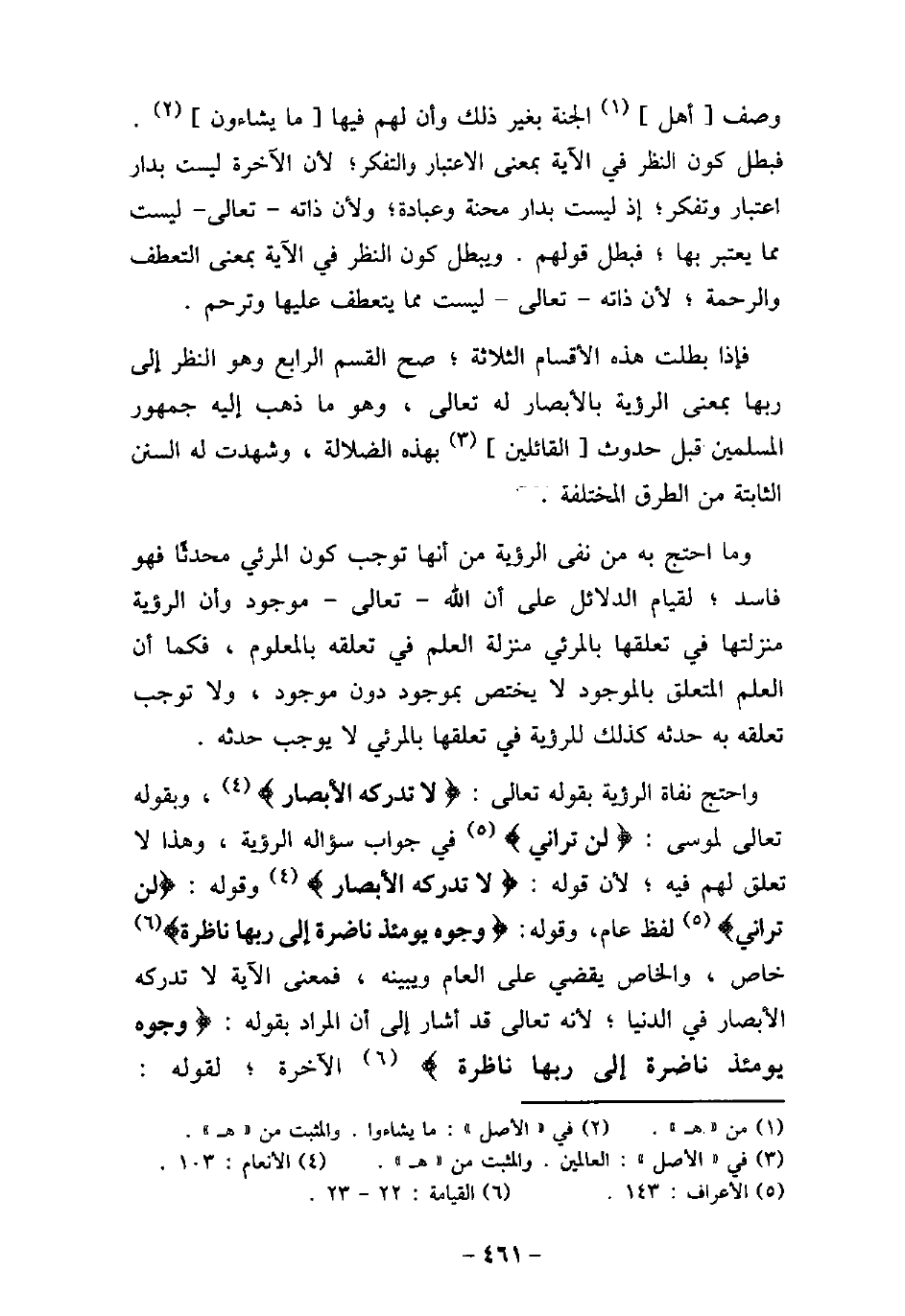 وصف أهل الجنة بغير ذلك وأن لهم فيها ما يشاءون. فبطل كون النظر فى الآية بمعنى الاعتبار والتفكر؛ لأن الآخرة ليست بدار اعتبار وتفكر؛ إذ ليست بدار محنة وعبادة؛ ولأن ذاته تعالى ليست مما يعتبر بها؛ فبطل قولهم. ويبطل كون النظر فى الآية بمعنى التعطف والرحمة؛ لأن ذاته تعالى ليست مما يتعطف عليها وترحم. فإذا بطلت هذه الأقسام الثلاثة؛ صح القسم الرابع وهو النظر إلى ربها بمعنى الرؤية بالأبصار له تعالى، وهو ما ذهب إليه جمهور المسلمين قبل حدوث القائلين بهذه الضلالة، وشهدت له السنن الثابتة من الطرق المختلفة. وما احتج به من نفى الرؤية من أنها توجب كون المرئى محدثًا فهو فاسد؛ لقيام الدلائل على أن الله تعالى موجود وأن الرؤية منزلتها فى تعلقها بالمرئى منزلة العلم فى تعلقه بالمعلوم، فكما أن العلم المتعلق بالموجود لا يختص بموجود دون موجود، ولا توجب تعلقه به حدثه كذلك للرؤية فى تعلقها بالمرئى لا يوجب حدثه. واحتج نفاة الرؤية بقوله تعالى: (لاَّ تُدْرِكُهُ الأَبْصَارُ) [الأنعام: 103] ، وبقوله تعالى لموسى: (لَن تَرَانِى) [الأعراف: 143] فى جوابه سؤاله الرؤية، وهذا لا تعلق لهم فيه؛ لأن قوله: (لاَّ تُدْرِكُهُ الأَبْصَارُ (وقوله: (لَن تَرَانِى (لفظ عام، وقوله: (وُجُوهٌ يَوْمَئِذٍ نَّاضِرَةٌ إِلَى رَبِّهَا نَاظِرَةٌ) [القيامة: 22، 23] ، خاص، والخاص يقضى على العام ويبينه، فمعنى الآية لا تدركه الأبصار فى الدنيا؛ لأنه تعالى قد أشار إلى أن المراد بقوله: (وُجُوهٌ يَوْمَئِذٍ نَّاضِرَةٌ إِلَى رَبِّهَا نَاظِرَةٌ (الآخرة؛ لقوله: