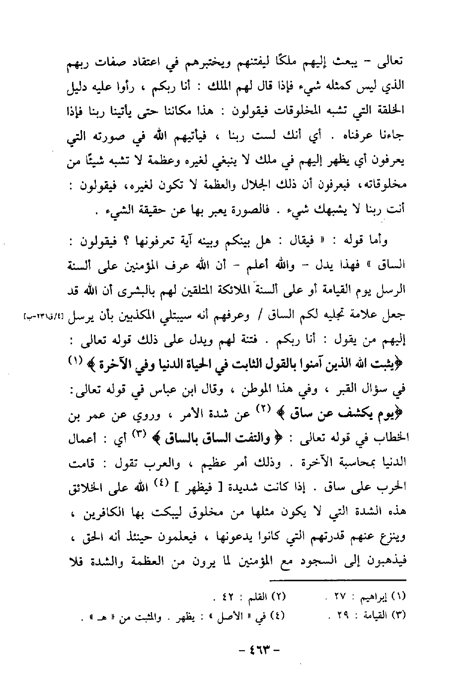 تعالى يبعث إليهم ملكًا ليفتنهم ويختبرهم فى اعتقاد صفات ربهم الذى ليس كمثله شىء فإذا قال لهم الملك: أنا ربكم، رأوا عليه دليل الخلقة التى تشبه المخلوقات فيقولون: هذا مكاننا حتى يأتينا ربنا فإذا جاءنا عرفناه. أى أنك لست ربنا، فيأتيهم الله فى صورته التى يعرفون أى يظهر إليهم فى ملك لا ينبغى لغيره وعظمة لا تشبه شيئًا من مخلوقاته، فيعرفون أن ذلك الجلال والعظمة لا تكون لغيره، فيقولون: أنت ربنا لا يشبهك شىء. فالصورة يعبر بها عن حقيقة الشئ. وأما قوله: (فيقال: هل بينكم وبينه آية تعرفونها؟ فيقولون: الساق) فهذا يدل والله أعلم أن الله عرف المؤمنين على ألسنة الرسل يوم القيامة أو على ألسنة الملائكة المتلقين لهم بالبشرى أن الله قد جعل علامة تجلبه لكم الساق وعرفهم أنه سيبتلى المكذبين بأن يرسل إليهم من يقول: أنا ربكم. فتنة لهم ويدل على ذلك قوله تعالى: (يُثَبِّتُ اللهُ الَّذِينَ آمَنُوا بِالْقَوْلِ الثَّابِتِ فِى الْحَيَاةِ الدُّنْيَا وَفِى الآخِرَةِ) [إبراهيم: 27] ، فى سؤال القبر، وفى هذا الموطن، وقال ابن عباس فى قوله تعالى: (يَوْمَ يُكْشَفُ عَن سَاقٍ) [القلم: 42] عن شدة الأمر، وروى عن عمر بن الخطاب فى قوله تعالى: (وَالْتَفَّتِ السَّاقُ بِالسَّاقِ) [القيامة: 29] أى: أعمال الدنيا بمحاسبة الآخرة. وذلك أمر عظيم، والعرب تقول: قامت الحرب على ساق. إذا كانت شديدة فيظهر الله على الخلائق هذه الشدة التى لا يكون مثلها من مخلوق ليبكت بها الكافرين، وينزع عنهم قدرتهم التى كانوا يدعونها، فيعلمون حينئذ أنه الحق، فيذهبون إلى السجود مع المؤمنين لما يرون من العظمة والشدة فلا