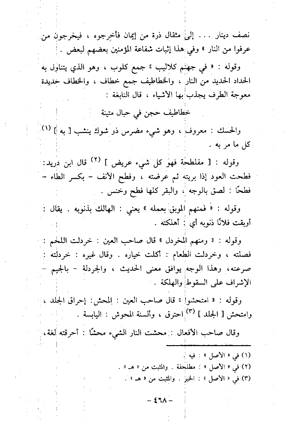 نصف دينار. . إلى مثقال ذرة من إيمان فأخرجوه، فيخرجون من عرفوا من النار) وفى هذا إثبات شفاعة المؤمنين بعضهم لبعض. وقوله: (فى جهنم كلاليب) جمع كلوب، وهو الذى يتناول به الحداد الحديد من النار، والخطاطيف جمع خطاف، والخطاف حديدة معوجة الطرف يجذب بها الأشياء، قال النابغة: خطاطيف حجن فى حبال متينة والحسك: معروف، وهو شىء مضرس ذو شوك ينشب به كل ما مر به. وقوله: (فمنهم الموبق بعمله) يعنى: الهالك بذنوبه. يقال: أوبقت فلانًا ذنوبه أى: أهلكته. وقوله: (ومنهم المخردل) قال صاحب العين: خردلت اللحم: فصلته، وخردلت الطعام: أكلت خياره. وقال غيره: خردلته: صرعته، وهذا الوجه يوافق معنى الحديث، والجردلة بالجيم، الإشراف على السقوط والهلكة. وقوله: (امتحشوا) قال صاحب العين: المحش: إحراق الجلد، وامتحش الجلد احترق، وألسنة المحوش: اليابسة. وقال صاحب الأفعال: محشت النار الشىء محشًا: أحرقته لغة،