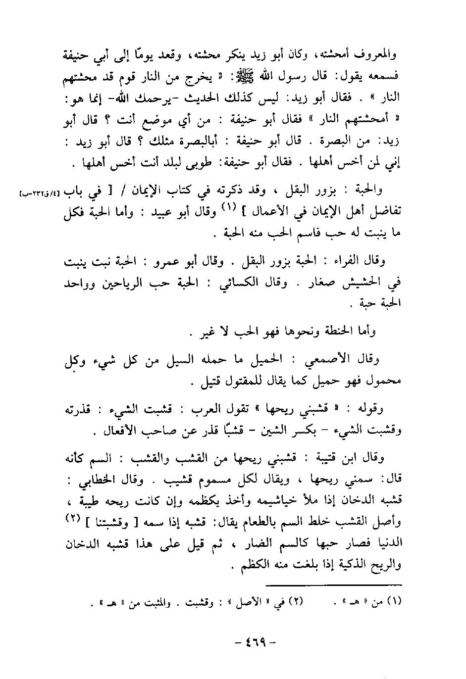 والمعروف أمحشته، وكان أبو زيد ينكر محشته، وقعد يومًا إلى أبى حنيفة فسمعه يقول: قال رسول الله (صلى الله عليه وسلم) : (يخرج من النار قوم قد محشتهم النار) . فقال أبو زيد: ليس كذلك الحديث، يرحمك الله، إنما هو: (أمحشتهم النار) فقال أبو جنيفة: من أى موضع أنت؟ قال أبو زيد: من البصرة. قال أبو حنيفة: أبالبصرة مثلك؟ قال أبو زيد: إنى لمن أخس أهلها. فقال أبو حنيفة: طوبى لبلد أنت أخس أهلها. والحبة: بزور البقل، وقد ذكرته فى كتاب الإيمان فى باب تفاضل أهل الإيمان فى الأعمال وقال أبو عبيد: وأما الحبة فكل ما ينبت له حب فاسم الحب منه الحبة. وقال الفراء: الحبة بزور البقل. وقال أبو عمرو: الحبة نبت ينبت فى الحشيش صغار. وقال الكسائى: الحبة حب الرياحين وواحد الحبة حبة. وأما الحنطة ونحوها فهو الحب لا غير. وقال الأصمعى: الحميل ما حمله السيل من كل شىء وكل محمول فهو حميل كما يقال للمقتول قتيل. وقوله: (قشبنى ريحها) تقول العرب: قشبت الشئ: قذرته وقشبت الشىء، بكسر الشين، قشبًا قذر صاحب الأفعال. وقال ابن قتيبة: قشبنى ريحها من القشب والقشب: السم كأنه قال: سمنى ريحها، ويقال لكل مسموم قشيب. وقال الخطابى: قشبه الدخان إذا مل خياشيمه وأخذ يكظمه وإن كانت ريحه طيبة، وأصل القشب خلط السم بالطعام يقال: قشبه إذا سمه وقشبتنا الدنيا فصار حبها كالسم الضار، ثم قيل على هذا قشبه الدخان والريح الذكية إذا بلغت منه الكظم.