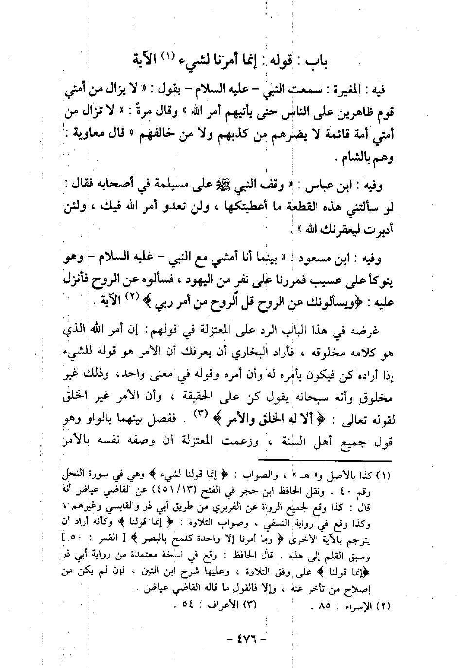 / 77 - فيه: الْمُغِيرَة، سَمِعْتُ النَّبِىَّ، عليه السَّلام، يَقُولُ: (لا يَزَالُ مِنْ أُمَّتِى قَوْمٌ ظَاهِرِينَ عَلَى النَّاسِ حَتَّى يَأْتِيَهُمْ أَمْرُ اللَّهِ) . وَقَالَ مرة: (لا تَزَالُ مِنْ أُمَّتِى أُمَّةٌ قَائِمَةٌ بِأَمْرِ اللَّهِ، مَا يَضُرُّهُمْ مَنْ كَذَّبَهُمْ، وَلا مَنْ خَالَفَهُمْ) . وَقَالَ مُعَاوِيَة: وَهُمْ بِالشَّأْمِ. / 78 - وفيه: ابْن عَبَّاس، وَقَفَ النَّبِىُّ (صلى الله عليه وسلم) عَلَى مُسَيْلِمَةَ فِى أَصْحَابِهِ، فَقَالَ: (لَوْ سَأَلْتَنِى هَذِهِ الْقِطْعَةَ مَا أَعْطَيْتُكَهَا، وَلَنْ تَعْدُوَ أَمْرَ اللَّهِ فِيكَ، وَلَئِنْ أَدْبَرْتَ لَيَعْقِرَنَّكَ اللَّهُ) . / 79 - وفيه: ابْن مَسْعُود، بَيْنَما أَنَا أَمْشِى مَعَ النَّبِىِّ (صلى الله عليه وسلم) وَهُوَ يَتَوَكَّأُ عَلَى عَسِيبٍ مَعَهُ، فَمَرَرْنَا عَلَى نَفَرٍ مِنَ الْيَهُودِ، فسَألُوهُ عَنِ الرُّوحِ، فَأَنَزل عليه: (وَيَسْأَلُونَكَ عَنِ الرُّوحِ قُلِ الرُّوحُ مِنْ أَمْرِ رَبِّى) [الإسراء: 85] الآية. غرضه فى هذا الباب الرد على المعتزلة فى قولهم: إن أمر الله الذى هو كلامه مخلوق، فأراد البخارى أن يعرفك أن الأمر هو قوله للشىء إذا أراده كن فيكون بأمره له وأن أمره وقوله فى معنى واحد، وذلك غير مخلوق وأنه سبحانه يقول كن على الحقيقة، وأن الأمر غير الخلق لقوله تعالى: (أَلاَ لَهُ الْخَلْقُ وَالأَمْرُ) [الأعراف: 54] ، ففصل بينهما بالواو وهو قول جميع أهل السنة، وزعمت المعتزلة أن وصفه نفسه بالأمر
