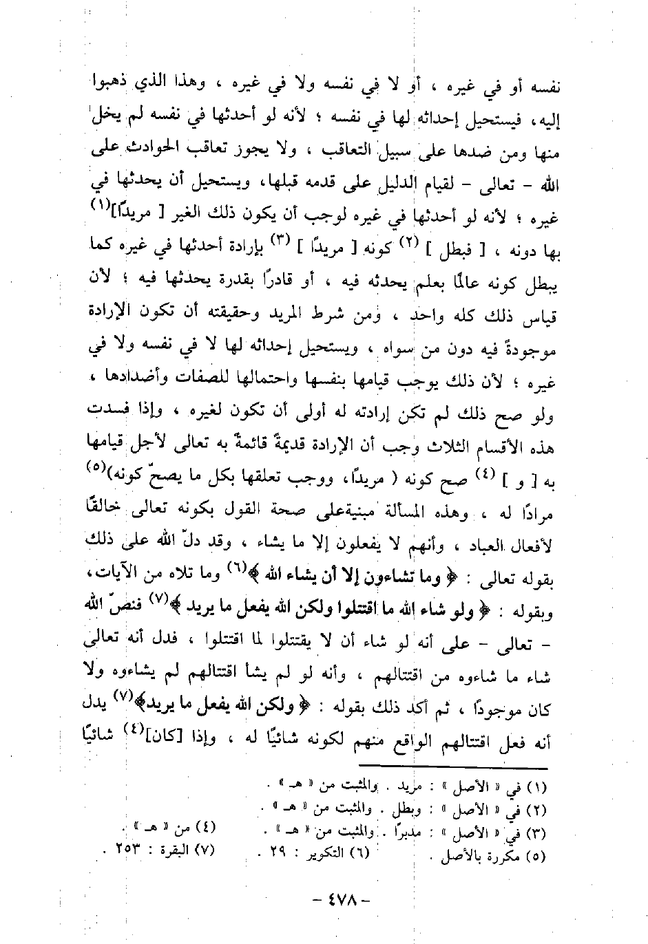 نفسه أو فى غيره، أو لا فى نفسه ولا فى غيره، وهذا الذى ذهبوا إليه، فيستحيل إحداثه لها فى نفسه؛ لأنه لو أحدثها فى نفسه لم يخل منها ومن ضدها على سبيل التعاقب، ولا يجوز تعاقب الحوادث على الله تعالى لقيام الدليل على قدمه قبلها، ويستحيل أن يحدثها فى غيره؛ لأنه لو أحدثها فى غيره لوجب أن يكون ذلك الغير مريدًا بها دونه، فبطل كونه مريدًا بإرادة أحدثها فى غيره كما يبطل كونه عالمًا بعلم يحدثه فيه، أو قادرًا بقدرة يحدثها فيه؛ لأن قياس ذلك كله واحد، ومن شرط المريد وحقيقته أن تكون الإرادة موجودةً فيه دون من سواه، ويستحيل إحداثه لها إلا فى نفسه ولا فى غيره؛ لأن ذلك يوجب قيامها بنفسها واحتمالها للصفات وأضدادها، ولو صح ذلك لم تكن إرادته له أولى أن تكون لغيره، وإذا فسدت هذه الأقسام الثلاث وجب أن الإرادة قديمةً قائمةً به تعالى لأجل قيامها به وصح كونه مريدًا، ووجب تعلقها بكل ما يصحّ كونه مرادًا له، وهذه المسألة مبنية على صحة القول بكونه تعالى خالقًا لأفعال العباد، وأنهم لا يفعلون إلا ما يشاء، وقد دلّ الله على ذلك بقوله تعالى: (وَمَا تَشَاءُونَ إِلا أَنْ يَشَاءَ) [الإنسان: 30] ، وما تلاه من الآيات، وبقوله: (وَلَوْ شَاء اللهُ مَا اقْتَتَلُوا وَلَكِنَّ اللهَ يَفْعَلُ مَا يُرِيدُ (فنصّ الله تعالى على أنه لو شاء أن لا يقتتلوا لما اقتتلوا، فدل أنه تعالى شاء ما شاءوه من اقتتالهم، وأنه لو لم يشأ اقتتالهم لم يشاءوه ولا كان موجودًا، ثم أكد ذلك بقوله: (وَلَكِنَّ اللهَ يَفْعَلُ مَا يُرِيدُ (يدل أنه فعل اقتتالهم الواقع منهم لكونه شائيًا له، وإذا كان شائيًا
