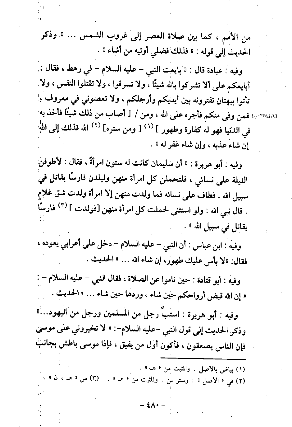 مِنَ الأمَمِ، كَمَا بَيْنَ صَلاةِ الْعَصْرِ إِلَى غُرُوبِ الشَّمْسِ. . .) وذكر الحديث إلى قوله: (فَذَلِكَ فَضْلِى أُوتِيهِ مَنْ أَشَاءُ) . / 84 - وفيه: عُبَادَة، قَالَ: (بَايَعْتُ النَّبِىّ (صلى الله عليه وسلم) فِى رَهْطٍ، فَقَالَ: (أُبَايِعُكُمْ عَلَى أَنْ لا تُشْرِكُوا بِاللَّهِ شَيْئًا، وَلا تَسْرِقُوا، وَلا تَزْنُوا، وَلا تَقْتُلُوا أَوْلادَكُمْ، وَلا تَأْتُوا بِبُهْتَانٍ تَفْتَرُونَهُ بَيْنَ أَيْدِيكُمْ وَأَرْجُلِكُمْ، وَلا تَعْصُونِى فِى مَعْرُوفٍ، فَمَنْ وَفَى مِنْكُمْ فَأَجْرُهُ عَلَى اللَّهِ، وَمَنْ أَصَابَ مِنْ ذَلِكَ شَيْئًا، فَأُخِذَ بِهِ فِى الدُّنْيَا، فَهُوَ لَهُ كَفَّارَةٌ وَطَهُورٌ، وَمَنْ سَتَرَهُ اللَّهُ فَذَلِكَ إِلَى اللَّهِ إِنْ شَاءَ عَذَّبَهُ، وَإِنْ شَاءَ غَفَرَ لَهُ) . / 85 - وفيه: أَبُو هُرَيْرَةَ، أَنَّ سُلَيْمَانَ كَانَ لَهُ سِتُّونَ امْرَأَةً، فَقَالَ: لأطُوفَنَّ اللَّيْلَةَ عَلَى نِسَائِى، فَلْتَحْمِلْنَ كُلُّ امْرَأَةٍ، وَلْتَلِدْنَ فَارِسًا، يُقَاتِلُ فِى سَبِيلِ اللَّهِ، فَطَافَ عَلَى نِسَائِهِ، فَمَا وَلَدَتْ مِنْهُنَّ إِلا امْرَأَةٌ وَلَدَتْ شِقَّ غُلامٍ) ، قَالَ نَبِىُّ اللَّهِ (صلى الله عليه وسلم) : (ولَوْ اسْتَثْنَى لَحَمَلَتْ كُلُّ امْرَأَةٍ مِنْهُنَّ، فَوَلَدَتْ فَارِسًا يُقَاتِلُ فِى سَبِيلِ اللَّهِ) . / 86 - وفيه: أَبُو قَتَادَةَ، حِينَ نَامُوا عَنِ الصَّلاةِ، قَالَ النَّبِىُّ (صلى الله عليه وسلم) : (إِنَّ اللَّهَ قَبَضَ أَرْوَاحَكُمْ حِينَ شَاءَ، وَرَدَّهَا حِينَ شَاءَ. . .) الحديث. / 87 - وفيه: أَبُو هُرَيْرَةَ، اسْتَبَّ رَجُلٌ مِنَ الْمُسْلِمِينَ وَرَجُلٌ مِنَ الْيَهُودِ. . . وذكر الحديث إلى قول النَّبِىّ (صلى الله عليه وسلم) : (لا تُخَيِّرُونِى عَلَى مُوسَى، فَإِنَّ النَّاسَ يَصْعَقُونَ، فَأَكُونُ أَوَّلَ مَنْ يُفِيقُ، فَإِذَا مُوسَى بَاطِشٌ بِجَانِبِ