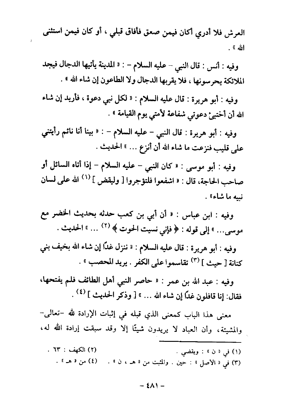 الْعَرْشِ، فَلا أَدْرِى أَكَانَ فِيمَنْ صَعِقَ فَأَفَاقَ قَبْلِى، أَوْ كَانَ مِمَّنِ اسْتَثْنَى اللَّهُ) . / 88 - وفيه: أَنَس، قَالَ النَّبِيّ - عليه السلام -: (الْمَدِينَةُ يَأْتِيهَا الدَّجَّالُ، فَيَجِدُ الْمَلائِكَةَ يَحْرُسُونَهَا، فَلا يَقْرَبُهَا الدَّجَّالُ، وَلا الطَّاعُونُ إِنْ شَاءَ اللَّهُ) . / 89 - وفيه: أَبُو هُرَيْرَةَ، قَالَ (صلى الله عليه وسلم) : (لِكُلِّ نَبِىٍّ دَعْوَةٌ، فَأُرِيدُ إِنْ شَاءَ اللَّهُ أَنْ أَخْتَبِىَ دَعْوَتِى شَفَاعَةً لأمَّتِى يَوْمَ الْقِيَامَةِ) . / 90 - وفيه: أَبُو هُرَيْرَةَ، قَالَ النَّبِىّ، عليه السَّلام: (بَيْنَا أَنَا نَائِمٌ، رَأَيْتُنِى عَلَى قَلِيبٍ، فَنَزَعْتُ مَا شَاءَ اللَّهُ أَنْ أَنْزِعَ. . .) الحديث. / 91 - وفيه: أَبُو مُوسَى، كَانَ النَّبِىُّ (صلى الله عليه وسلم) إِذَا أَتَاهُ السَّائِلُ، أَوْ صَاحِبُ الْحَاجَةِ، قَالَ: (اشْفَعُوا فَلْتُؤْجَرُوا، ولَيَقْضِى اللَّهُ عَلَى لِسَانِ نبيه مَا شَاءَ) . / 92 - وفيه: ابْن عَبَّاس، أن أُبَىُّ بْنُ كَعْبٍ حدثه بحديث الخضر. . . إلى قوله: (فَإِنِّى نَسِيتُ الْحُوتَ) [الكهف: 63] الحديث. / 93 - وفيه: أَبُو هُرَيْرَةَ، قَالَ (صلى الله عليه وسلم) : (نَنْزِلُ غَدًا إِنْ شَاءَ اللَّهُ بِخَيْفِ بَنِى كِنَانَةَ حَيْثُ تَقَاسَمُوا عَلَى الْكُفْرِ) ، يُرِيدُ الْمُحَصَّبَ. / 94 - وفيه: عَبْدِاللَّهِ ابْنِ عُمَرَ، حَاصَرَ النَّبِىُّ (صلى الله عليه وسلم) أَهْلَ الطَّائِفِ، فَلَمْ يَفْتَحْهَا، فَقَالَ: (إِنَّا قَافِلُونَ غَدًا، إِنْ شَاءَ اللَّهُ. . .) ، وذكر الحديث. معنى هذا الباب كمعنى الذى قبله فى إثبات الإرادة لله تعالى والمشيئة، وأن العباد لا يريدون شيئًا إلا وقد سبقت إرادة الله له،