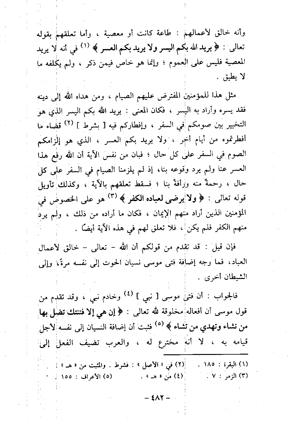 وأنه خالق لأعمالهم: طاعة كانت أو معصية، وأما تعلقهم بقوله تعالى: (يُرِيدُ اللهُ بِكُمُ الْيُسْرَ وَلاَ يُرِيدُ بِكُمُ الْعُسْرَ) [البقرة: 185] فى أنه لا يرد المعصية فليس على العموم؛ وإنما هو خاص فيمن ذكر، ولم يكلفه ما لا يطيق. مثل هذا للمؤمنين المفترض عليهم الصيام، ومن هداه الله إلى دينه فقد يسره وأراد به اليسر، فكان المعنى: يريد الله بكم اليسر الذى هو التخيير بين صومكم فى السفر، وإفطاركم فيه بشرط قضاء ما أفطرتموه من أيام أخر، ولا يريد بكم العسر، الذى هو إلزامكم الصوم فى السفر على كل حال؛ فبان من نفس الآية أن الله رفع هذا العسر عنا ولم يرد وقوعه بنا، إذ لم يلزمنا الصيام فى السفر على كل حال، ورحمةً منه ورأفةً بنا؛ فسقط تعلقهم بالآية، وكذلك تأويل قوله تعالى: (وَلاَ يَرْضَى لِعِبَادِهِ الْكُفْرَ) [الزمر: 7] هو على الخصوص فى المؤمنين الذين أراد منهم الإيمان، فكان ما أراده من ذلك، ولم يرد منهم الكفر فلم يكن، فلا تعلق لهم فى هذه الآية أيضًا. فإن قيل: قد تقدم من قولكم أن الله تعالى خالق لأعمال العباد، فما وجه إضافة فتى موسى نسيان الحوت إلى نفسه مرةً، وإلى الشيطان أخرى. فالجواب: أن فتى موسى نبى وخادم نبى، وقد تقدم من قول موسى أن أفعاله مخلوقة لله تعالى: (إِنْ هِىَ إِلاَّ فِتْنَتُكَ تُضِلُّ بِهَا مَن تَشَاء وَتَهْدِى مَن تَشَاء) [الأعراف: 155] ، فثبت أن إضافة النسيان إلى نفسه لأجل قيامه به، لا أنه مخترع له، والعرب تضيف الفعل إلى