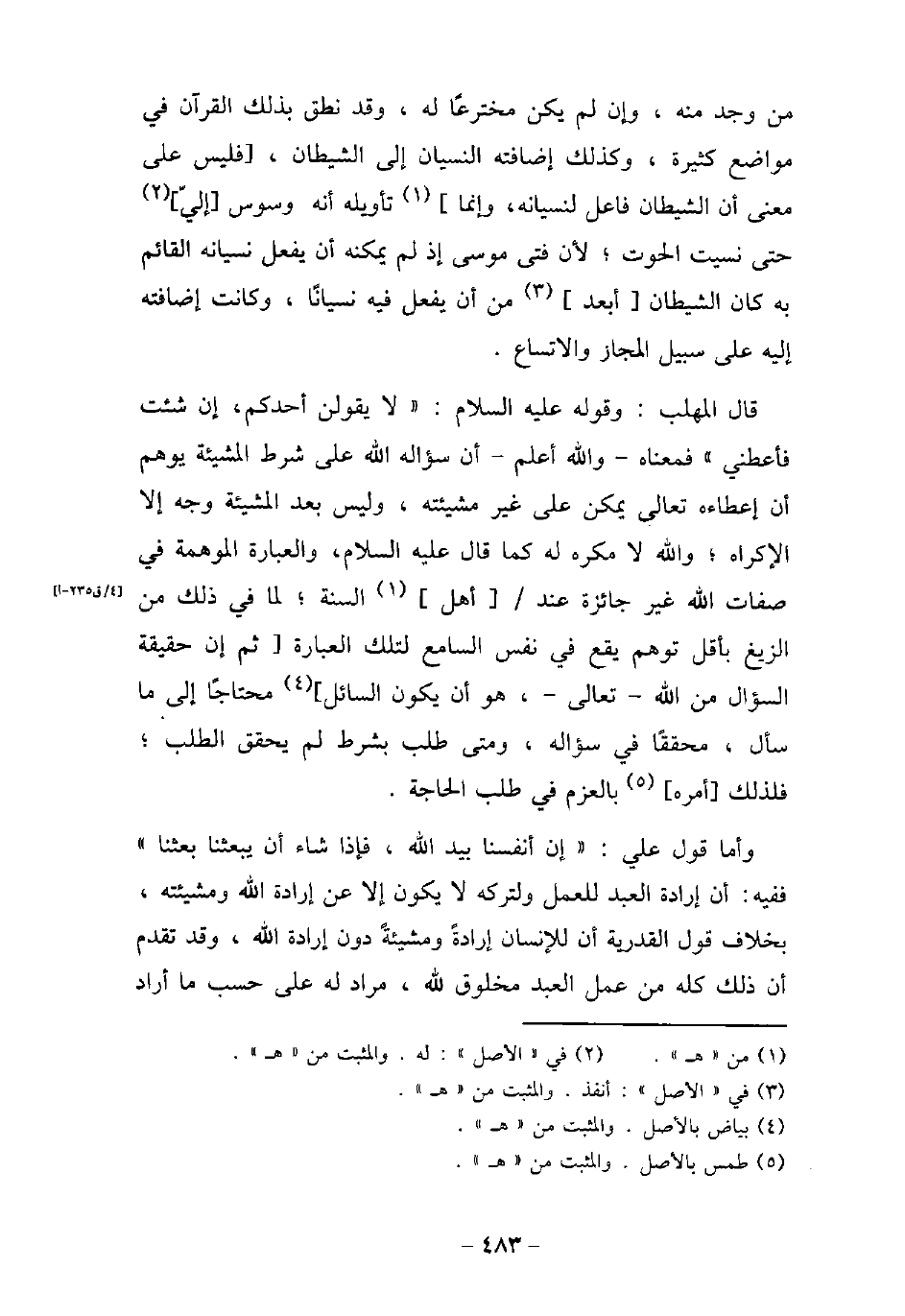 من وجد منه، وإن لم يكن مخترعًا له، وقد نطق بذلك القرآن فى مواضع كثيرة، وكذلك إضافته النسيان إلى الشيطان، فليس على معنى أن الشيطان فاعل لنسيانه، وإنما تأويله أنه وسوس إلىّ حتى نسيت الحوت؛ لأن فتى موسى إذ لم يمكنه أن يفعل نسيانه القائم به كان الشيطان أبعد من أن يفعل فيه نسيانًا، وكانت إضافته إليه على سبيل المجاز والاتساع. قال المهلب: وقوله (صلى الله عليه وسلم) : (لا يقولن أحدكم، إن شئت فاعطنى) فمعناه والله أعلم أن سؤاله الله على شرط المشيئة يوهم أن إعطاءه تعالى يمكن على غير مشيئته، وليس بعد المشيئة وجه إلا الإكراه؛ والله لا مكره له كما قال (صلى الله عليه وسلم) ، والعبارة الموهمة فى صفات الله غير جائزة عند أهل السنة؛ لما فى ذلك من الزيغ بأقل توهم يقع فى نفس السامع لنلك العبارة ثم إن حقيقة السؤال من الله تعالى، هو أن يكون السائل محتاجًا إلى ما سأل، محققًا فى سؤاله، ومتى طلب بشرط لم يحقق الطلب؛ فلذلك أمره بالعزم فى طلب الحاجة. وأما قول على: (إن أنفسنا بيد الله، فإذا شاء أن يبعثنا بعثنا) ففيه: أن إرادة العبد للعمل ولتركه لا يكون إلا عن إرادة الله ومشيئته، بخلاف قول القدرية أن للإنسان إرادةً ومشيئةً دون إرادة الله، وقد تقدم أن ذلك كله من عمل العبد مخلوق لله، مراد له على حسب ما أراد