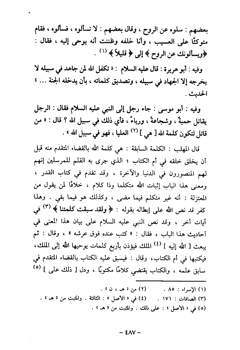 بَعْضُهُمْ: سَلُوهُ عَنِ الرُّوحِ، وَقَالَ بَعْضُهُمْ: لا تَسْأَلُوهُ، فَسَأَلُوهُ فَقَامَ مُتَوَكِّئًا عَلَى الْعَسِيبِ، وَأَنَا خَلْفَهُ، فَظَنَنْتُ أَنَّهُ يُوحَى إِلَيْهِ، فَقَالَ: (وَيَسْأَلُونَكَ عَنِ الرُّوحِ (إلى) قَلِيلاً) [الإسراء: 85] . / 99 - وفيه: أَبُو هُرَيْرَةَ، قَالَ (صلى الله عليه وسلم) : (تَكَفَّلَ اللَّهُ لِمَنْ جَاهَدَ فِى سَبِيلِهِ لا يُخْرِجُهُ إِلا الْجِهَادُ فِى سَبِيلِهِ وَتَصْدِيقُ كَلِمَاتِهِ، بِأَنْ يُدْخِلَهُ الْجَنَّةَ. . .) الحديث. / 100 - وفيه: أَبُو مُوسَى، جَاءَ رَجُلٌ إِلَى النَّبِىِّ (صلى الله عليه وسلم) فَقَالَ: الرَّجُلُ يُقَاتِلُ حَمِيَّةً، وَيُقَاتِلُ شَجَاعَةً، وَيُقَاتِلُ رِيَاءً، فَأَىُّ ذَلِكَ فِى سَبِيلِ اللَّهِ، قَالَ: (مَنْ قَاتَلَ لِتَكُونَ كَلِمَةُ اللَّهِ هِىَ الْعُلْيَا فَهُوَ فِى سَبِيلِ اللَّهِ) . قال المهلب: الكلمة السابقة: هى كلمة الله بالقضاء المتقدم منه قبل أن يخلق خلقه فى أم الكتاب؛ الذى جرى به القلم للمرسلين إنهم لهم المنصورون فى الدنيا والآخرة، وقد تقدم فى كتاب القدر، ومعنى هذا الباب إثبات الله متكلما وذا كلام، خلافًا لمن يقول من المعتزلة: أنه غير متكلم فيما مضى، وكذلك هو فيما بقى. وهذا كفر قد نص الله على إبطاله بقوله: (وَلَقَدْ سَبَقَتْ كَلِمَتُنَا) [الصافات: 171] فى آيات أخر، وقد نص النبى (صلى الله عليه وسلم) على بيان هذا المعنى فى أحاديث هذا الباب، فقال: (كتب عنده فوق عرشه) ، وقال: ثم يبعث الله إليه الملك فيؤذن بأربع كلمات يوحيها الله إلى الملك، فيكتبها فى أم الكتاب، وقال: فيسبق عليه الكتاب بالقضاء المتقدم فى سابق علمه، والكتاب يقتضي كلامًا مكتوبًا، ودل ذلك على