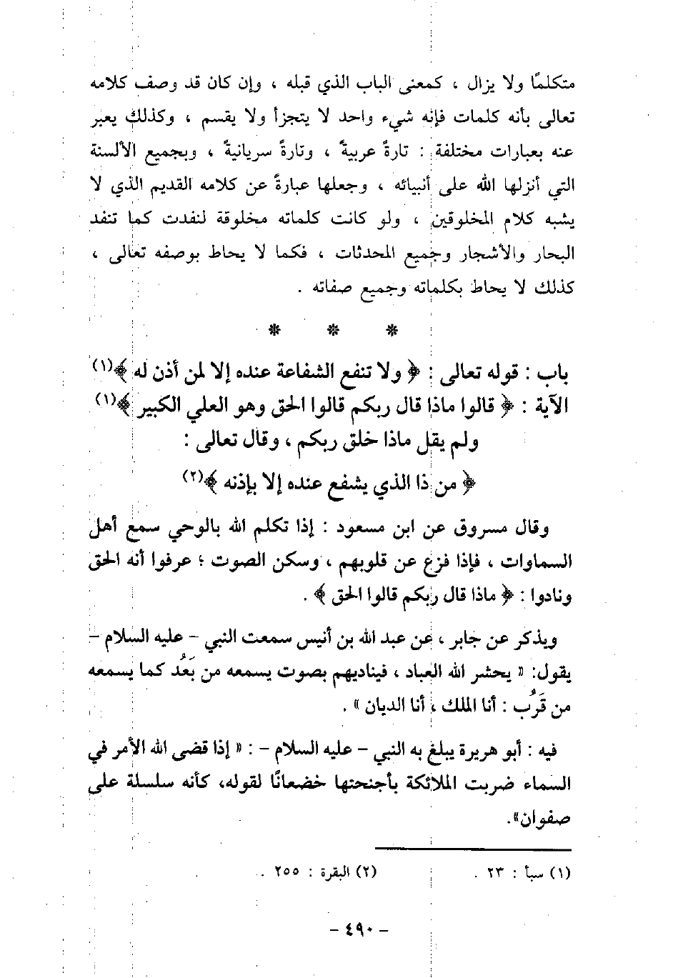 33 - بَاب قَوله تَعَالَى: (وَلا تَنْفَعُ الشَّفَاعَةُ عِنْدَهُ إِلا لِمَنْ أَذِنَ لَهُ (الآية) قَالُوا مَاذَا قَالَ رَبُّكُمْ قَالُوا الْحَقَّ وَهُوَ الْعَلِىُّ الْكَبِيرُ) [سبأ: 23] وَلَمْ يَقُلْ مَاذَا خَلَقَ رَبُّكُمْ وَقَالَ جَلَّ ذِكْرُهُ: (مَنْ ذَا الَّذِى يَشْفَعُ عِنْدَهُ إِلا بِإِذْنِهِ) [البقرة: 255]