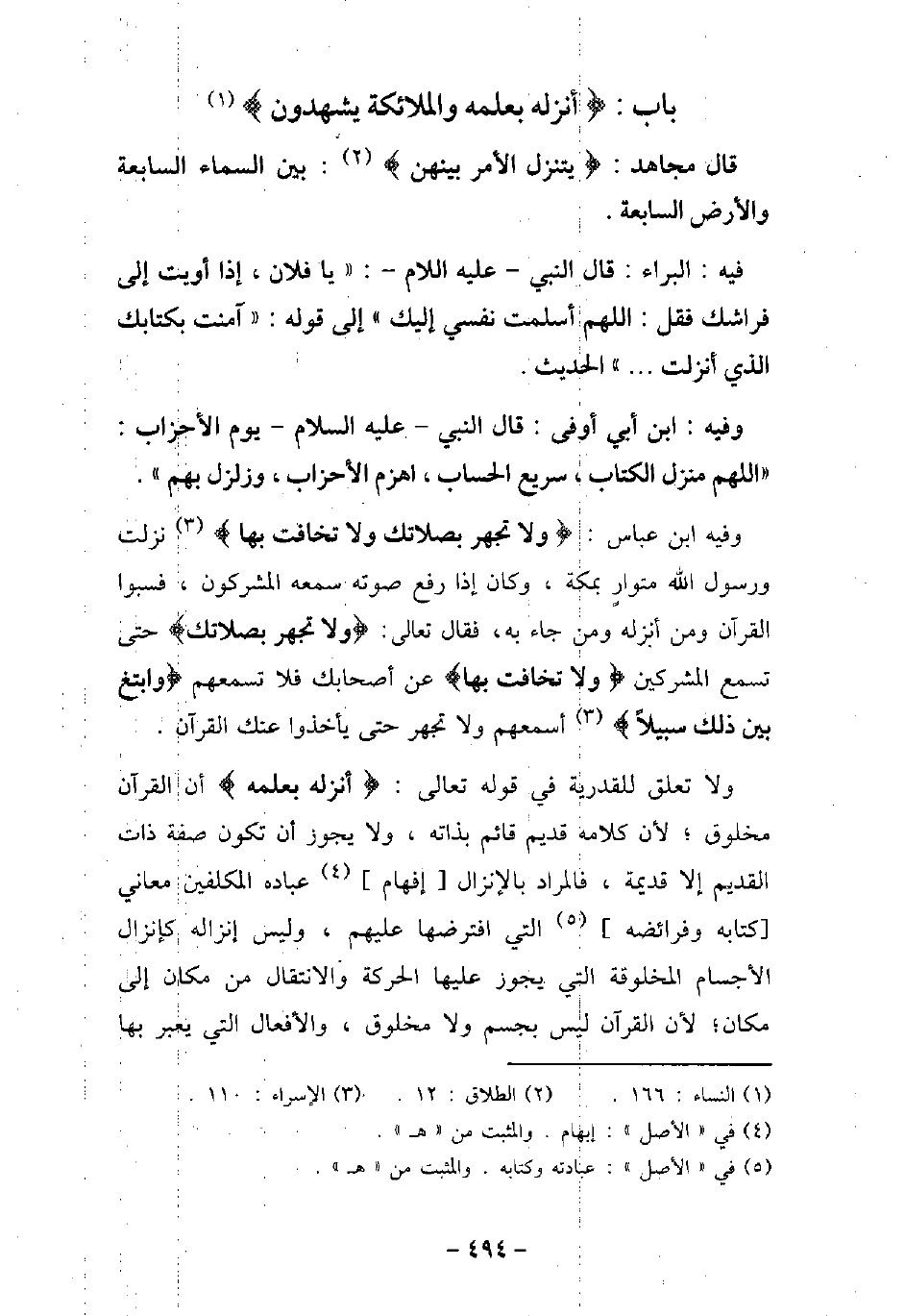 قَالَ مُجَاهِدٌ: (يَتَنَزَّلُ الأمْرُ بَيْنَهُنَّ) [الطلاق: 12] بَيْنَ السَّمَاءِ السَّابِعَةِ وَالأرْضِ السَّابِعَةِ. / 110 - فيه: الْبَرَاء، قَالَ النَّبِىّ (صلى الله عليه وسلم) : (يَا فُلانُ إِذَا أَوَيْتَ إِلَى فِرَاشِكَ، فَقُلِ: اللَّهُمَّ أَسْلَمْتُ نَفْسِى إِلَيْكَ. . . إلى قوله: (آمَنْتُ بِكِتَابِكَ الَّذِى أَنْزَلْتَ. . .) الحديث. / 111 - وفيه: ابْن أَبِى أَوْفَى، قَالَ النَّبِىّ (صلى الله عليه وسلم) : (يَوْمَ الأحْزَابِ: اللَّهُمَّ مُنْزِلَ الْكِتَابِ: سَرِيعَ الْحِسَابِ، اهْزِمِ الأحْزَابَ، وَزَلْزِلْ بِهِمْ) . / 112 - وفيه: ابْن عَبَّاس،) وَلا تَجْهَرْ بِصَلاتِكَ وَلا تُخَافِتْ بِهَا) [الإسراء: 110] أُنْزِلَتْ وَرَسُولُ اللَّهِ (صلى الله عليه وسلم) مُتَوَارٍ بِمَكَّةَ، وَكَانَ إِذَا رَفَعَ صَوْتَهُ، سَمِعَه الْمُشْرِكُونَ، فَسَبُّوا الْقُرْآنَ، وَمَنْ أَنْزَلَهُ وَمَنْ جَاءَ بِهِ، فَقَالَ تَعَالَى: (وَلا تَجْهَرْ بِصَلاتِكَ (يَسْمَعَ الْمُشْرِكُونَ،) وَلا تُخَافِتْ بِهَا (عَنْ أَصْحَابِكَ، فَلا تُسْمِعُهُمْ،) وَابْتَغِ بَيْنَ ذَلِكَ سَبِيلا (أَسْمِعْهُمْ، وَلا تَجْهَرْ حَتَّى يَأْخُذُوا عَنْكَ الْقُرْآنَ. ولا تعلق للقدرية فى قوله تعالى: (أَنْزَلَهُ بِعِلْمِهِ) [النساء: 166] أن القرآن مخلوق؛ لأن كلامه قديم قائم بذاته، ولا يجوز أن تكون صفة ذات القديم إلا قديمة، فالمراد بالإنزال إفهام عباده المكلفين معانى كتابه وفرائضه التى افترضها عليهم، وليس إنزاله كإنزال الأجسام المخلوقة التى يجوز عليها الحركة والانتقال من مكان إلى مكان؛ لأن القرآن ليس بجسم ولا مخلوق، والأفعال التى يعبر بها