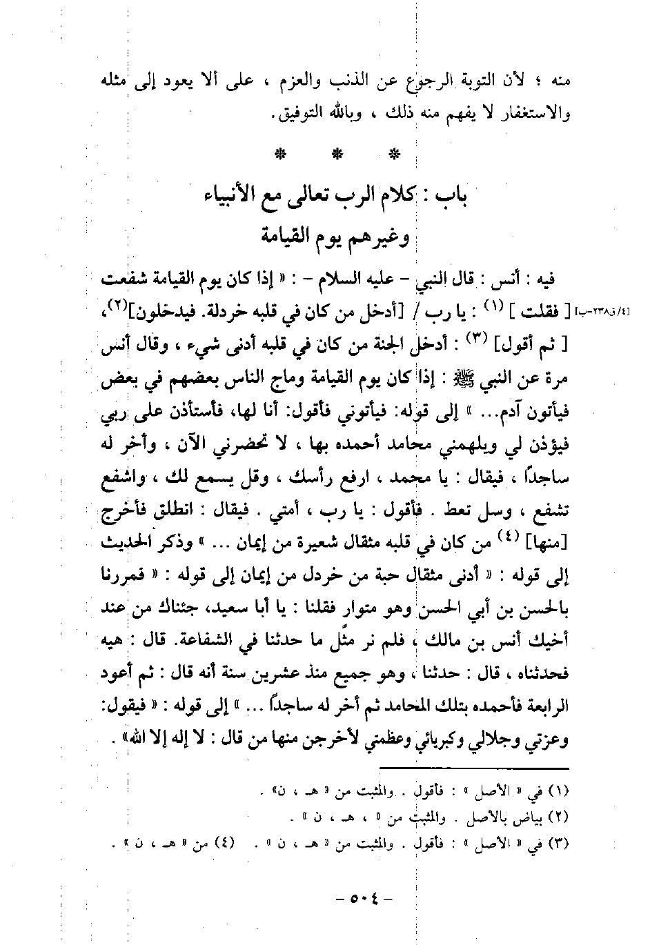 / 127 - فيه: أَنَس، قَالَ النَّبِىّ (صلى الله عليه وسلم) : (إِذَا كَانَ يَوْمُ الْقِيَامَةِ، شُفِّعْتُ، فَقُلْتُ: يَا رَبِّ، أَدْخِلِ الْجَنَّةَ مَنْ كَانَ فِى قَلْبِهِ خَرْدَلَةٌ، فَيَدْخُلُونَ، ثُمَّ أَقُولُ: أَدْخِلِ الْجَنَّةَ مَنْ كَانَ فِى قَلْبِهِ أَدْنَى شَىْءٍ. / 128 - وَقَالَ أَنَس مرة عن النَّبِىّ (صلى الله عليه وسلم) : (إِذَا كَانَ يَوْمُ الْقِيَامَةِ وَمَاجَ النَّاسُ بَعْضُهُمْ فِى بَعْضٍ، فَيَأْتُونَ آدَمَ. . .) إلى قوله: (فَيَأْتُونِى، فَأَقُولُ: أَنَا لَهَا، فَأَسْتَأْذِنُ عَلَى رَبِّى، فَيُؤْذَنُ لِى، وَيُلْهِمُنِى مَحَامِدَ أَحْمَدُهُ بِهَا، لا تَحْضُرُنِى الآنَ، فَأَحْمَدُهُ بِتِلْكَ الْمَحَامِدِ، وَأَخِرُّ لَهُ سَاجِدًا، فَيَقُولُ: يَا مُحَمَّدُ، ارْفَعْ رَأْسَكَ وَقُلْ: يُسْمَعْ لَكَ، وَسَلْ تُعْطَ، وَاشْفَعْ تُشَفَّعْ، فَأَقُولُ: يَا رَبِّ، أُمَّتِى، أُمَّتِى، فَيَقُولُ: انْطَلِقْ، فَأَخْرِجْ مِنْهَا مَنْ كَانَ فِى قَلْبِهِ مِثْقَالُ شَعِيرَةٍ مِنْ إِيمَانٍ. . .) وذكر الحديث إلى قوله: (أَدْنَى مِثْقَالِ حَبَّةِ خَرْدَلٍ مِنْ إِيمَانٍ) ، إلى قوله: (فَمَرَرْنَا بِالْحَسَنِ، وَهُوَ مُتَوَارٍ فِى مَنْزِلِ أَبِى خَلِيفَةَ، فَقُلْنَا: يَا أَبَا سَعِيدٍ، جِئْنَاكَ مِنْ عِنْدِ أَخِيكَ أَنَسِ ابْنِ مَالِكٍ، فَلَمْ نَرَ مِثْلَ مَا حَدَّثَنَا فِى الشَّفَاعَةِ، قَالَ: هِيهْ، فَحَدَّثْنَاهُ بِالْحَدِيثِ فَقَالَ: لَقَدْ حَدَّثَا، وَهُوَ جَمِيعٌ مُنْذُ عِشْرِينَ سَنَةً أَنَّهُ قَالَ: (ثُمَّ أَعُودُ الرَّابِعَةَ، فَأَحْمَدُهُ بِتِلْكَ الْمَحَامِدِ، ثُمَّ أَخِرُّ لَهُ سَاجِدًا. . .) إلى قوله: (فَيَقُولُ وَعِزَّتِى وَجَلالِى وَكِبْرِيَائِى وَعَظَمَتِى لأخْرِجَنَّ مِنْهَا مَنْ قَالَ: لا إِلَهَ إِلا اللَّهُ) .