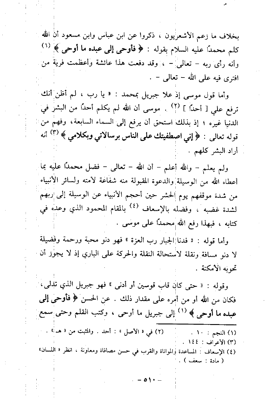 بخلاف ما زعم الأشعريون، ذكروا عن ابن عباس وابن مسعود أن الله كلم محمدًا (صلى الله عليه وسلم) بقوله: (فَأَوْحَى إِلَى عَبْدِهِ مَا أَوْحَى) [النجم: 10] ، وأنه رأى ربه تعالى، وقد دفعت هذا عائشة وأعظمت فرية من افترى فيه على الله تعالى. وأما قول موسى إذ علا جبريل بمحمد: (يا رب، لم أظن أنك ترفع على أحدًا. موسى أن الله لم يكلم أحدًا من البشر فى الدنيا غيره؛ إذ بذلك استحق أن يرفع إلى السماء السابعة، وفهم من قوله تعالى: (إِنِّى اصْطَفَيْتُكَ عَلَى النَّاسِ بِرِسَالاَتِى وَبِكَلاَمِى) [الأعراف: 144] أنه أراد البشر كلهم. ولم يعلم والله أعلم أن الله تعالى فضل محمدًا عليه بما أعطاه الله من الوسيلة والدعوة المقبولة منه شفاعة لأمته ولسائر الأنبياء من شدة موقفهم يوم الحشر حين أحجم الأنبياء عن الوسيلة إلى ربهم لشدة غضبه، وفضله بالإسعاف بالمقام المحمود الذى وعده فى كتابه، فبهذا رفع الله محمدًا على موسى. وأما قوله: (فدنا الجبار رب العزة) فهو دنو محبة ورحمة وفضيلة لا دنو مسافة ونقلة لاستحالة النقلة والحركة على البارى إذ لا يجوز أن تحويه الأمكنة. وقوله: (حتى كان قاب قوسين أو أدنى) فهو جبريل الذى تولى، فكان من الله أو من أمره على مقدار ذلك. عن الحسن) فَأَوْحَى إِلَى عَبْدِهِ مَا أَوْحَى) [النجم: 10] ، إلى جبريل ما أوحى، وكتب القلم وحتى سمع