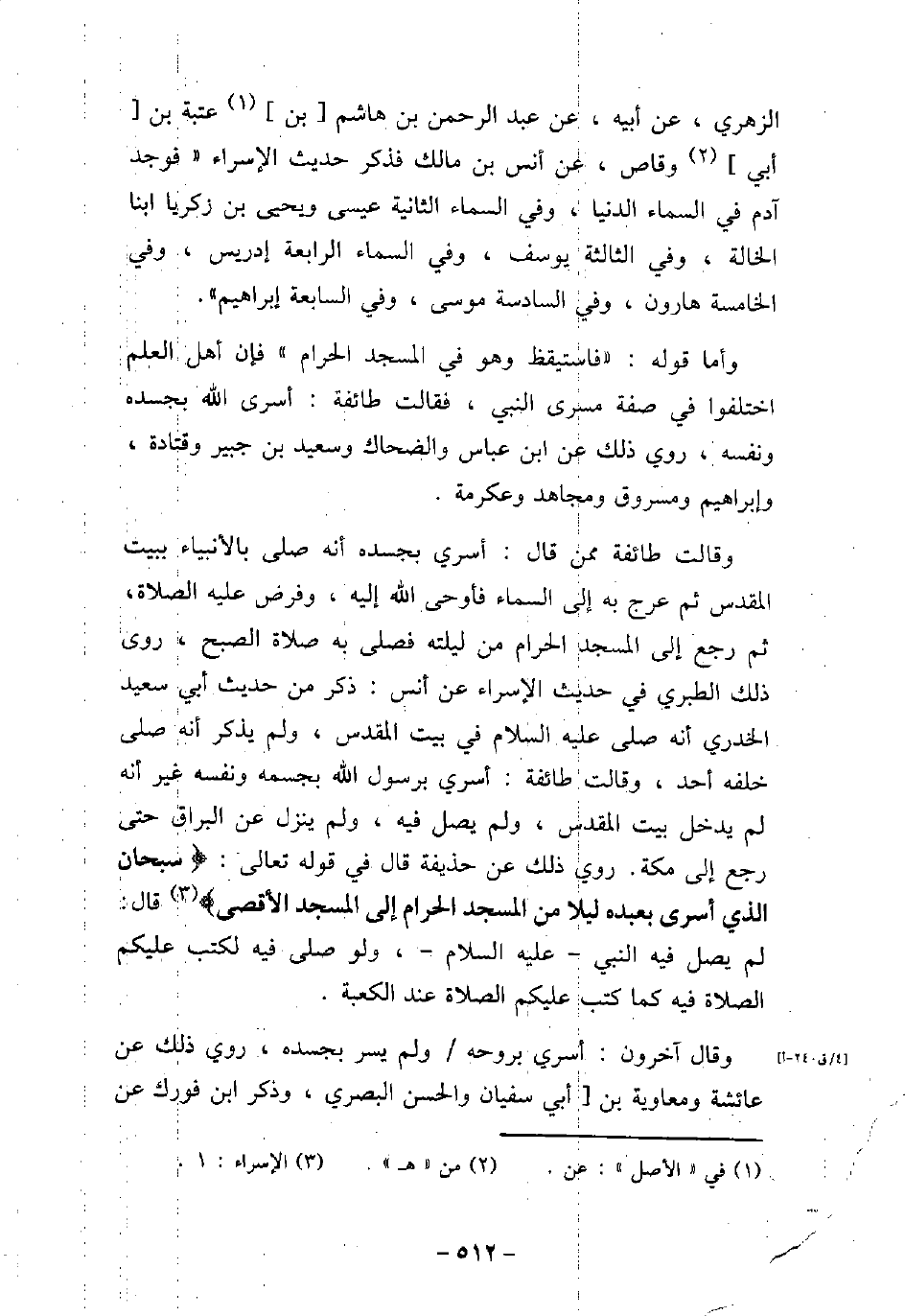 الزهري، عن أبيه، عن عبد الرحمن بن هاشم بن عتبة بن أبى وقاص، عن أنس بن مالك فذكر حديث الإسراء (فوجد آدم فى السماء الدنيا، وفى السماء الثانية عيسى ويحيى بن زكريا ابنا الخالة، وفى الثالثة يوسف، وفى السماء الرابعة إدريس، وفى الخامسة هارون، وفى السادسة موسى، وفى السابعة إبراهيم) . وأما قوله: (فاستيقظ وهو فى المسجد الحرام) فإن أهل العلم اختلفوا فى صفة مسرى النبى، فقالت طائفة: أسرى الله بجسده ونفسه، وروى ذلك عن ابن عباس والضحاك وسعيد بن جبير وقتادة، وإبراهيم ومسروق ومجاهد وعكرمة. وقالت طائفة ممن قال: أسرى بجسده أنه صلى بالأنبياء ببيت المقدس ثم عرج به إلى السماء فأوحى الله إليه، وفرض عليه الصلاة، ثم رجع إلى المسجد الحرام من ليلته فصلى به صلاة الصبح، روى ذلك الطبرى فى حديث الإسراء عن أنس: ذكر من حديث أبي سعيد الخدرى أنه صلى (صلى الله عليه وسلم) فى بيت المقدس، ولم يذكر أنه صلى خلفه أحد، وقالت طائفة: أسرى برسول الله بجسمه ونفسه غير أنه لم يدخل بيت المقدس، ولم يصل فيه، ولم ينزل عن البراق حتى رجع إلى مكة. روى ذلك عن حذيفة قال فى قوله تعالى: (سُبْحَانَ الَّذِى أَسْرَى بِعَبْدِهِ لَيْلاً مِّنَ الْمَسْجِدِ الْحَرَامِ إِلَى الْمَسْجِدِ الأَقْصَى) [الإسراء: 1] ، قال: لم يصل فيه النبي - عليه السلام -، ولو صلى فيه لكتب عليكم الصلاة فيه كما كتب عليكم الصلاة عند الكعبة. وقال آخرون: أسرى بروحه ولم يسر بجسده، روى ذلك عن عائشة ومعاوية بن أبى سفيان والحسن البصري، وذكر ابن فورك عن