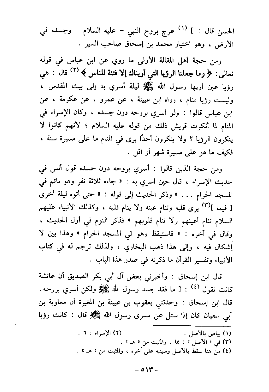 الحسن قال: عرج بروح النبي - عليه السلام - وجسده فى الأرض، وهو اختيار محمد بن إسحاق صاحب السير. ومن حجة أهل المقالة الأولى ما روى عن ابن عباس فى قوله تعالى: (وَمَا جَعَلْنَا الرُّؤيَا الَّتِي أَرَيْنَاكَ إِلاَّ فِتْنَةً لِّلنَّاسِ) [الإسراء: 60] ، قال: هى رؤيا عين أريها رسول الله (صلى الله عليه وسلم) ليلة أسرى به إلى بيت المقدس، وليست رؤيا منام، رواه ابن عيينة، عن عمرو، عن عكرمة، عن ابن عباس قالوا: ولو أسرى بروحه دون جسده، وكان الإسراء فى المنام لما أنكرت قريش ذلك من قوله (صلى الله عليه وسلم) ؛ لأنهم كانوا لا ينكرون الرؤيا؟ ولا ينكرون أحدًا يرى فى المنام ما على مسيرة سنة، فكيف ما هو على مسيرة شهر أو أقل. ومن حجة الذين قالوا: أسرى بروحه دون جسده قول أنس فى حديث الإسراء، قال حين أسرى به: (جاءه ثلاثة نفر وهو نائم فى المسجد الحرام. .) وذكر الحديث إلى قوله: (حتى أتوه ليلة أخرى فيما يرى قلبه وتنام عينه ولا ينام قلبه، وكذلك الأنبياء عليهم السلام تنام أعينهم ولا تنام قلوبهم) فذكر النوم فى أول الحديث، وقال فى آخره: (فاستيقظ وهو فى المسجد الحرام) وهذا بين لا إشكال فيه، وإلى هذا ذهب البخارى، ولذلك ترجم له فى كتاب الأنبياء وتفسير القرآن ما ذكرته فى صدر هذا الباب. قال ابن إسحاق: وأخبرنى بعض آل أبي بكر الصديق أن عائشة كانت تقول: ما فقد جسد رسول الله (صلى الله عليه وسلم) ولكن أسرى بروحه. قال ابن إسحاق: وحدثنى يعقوب بن عيينة بن المغيرة أن معاوية بن أبي سفيان كان إذا سئل عن مسرى رسول الله (صلى الله عليه وسلم) قال: كانت رؤيا