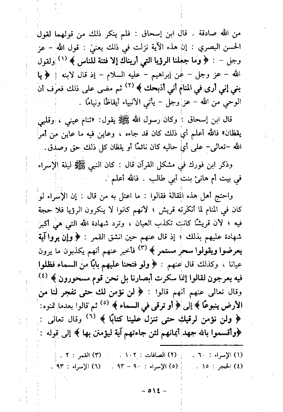 من الله صادقة. قال ابن إسحاق: فلم ينكر ذلك من قولهما لقول الحسن البصرى: إن هذه الآية نزلت فى ذلك يعنى: قول الله عز وجل: (وَمَا جَعَلْنَا الرُّؤيَا الَّتِى أَرَيْنَاكَ إِلاَّ فِتْنَةً لِّلنَّاسِ) [الإسراء: 60] ولقول الله عز وجل عن إبراهيم (صلى الله عليه وسلم) إذ قال لابنه: (يَا بُنَىَّ إِنِّى أَرَى فِى الْمَنَامِ أَنِّى أَذْبَحُكَ) [الصافات: 102] ، ثم مضى على ذلك فعرف أن الوحى من الله عز وجل يأتى الأنبياء أيقاظًا ونيامًا. قال ابن إسحاق: وكان رسول الله (صلى الله عليه وسلم) يقول: (تنام عينى، وقلبى يقظان) فالله أعلم أى ذلك كان قد جاءه، وعاين فيه ما عاين من أمر الله تعالى على أى حاليه كان نائمًا أو يقظان كل ذلك حق وصدق. وذكر ابن فورك فى مشكل القرآن قال: كان النبى (صلى الله عليه وسلم) ليلة الإسراء فى بيت أم هانئ بنت أبى طالب. فالله أعلم. واحتج أهل هذه المقالة فقالوا: ما اعتل به من قال: إن الإسراء لو كان فى المنام لما أنكرته قريش؛ لأنهم كانوا لا ينكرون الرؤيا فلا حجة فيه؛ لأن قريشًا كانت تكذب العيان، وترد شهادة الله التى هى أكبر شهادة عليهم بذلك؛ إذ قال عنهم حين انشق القمر: (وَإِن يَرَوْا آيَةً يُعْرِضُوا وَيَقُولُوا سِحْرٌ مُّسْتَمِرٌّ) [القمر: 2] ، فأخبر عنهم أنهم يكذبون ما يرون عيانا، وكذلك قال عنهم: (وَلَوْ فَتَحْنَا عَلَيْهِم بَابًا مِّنَ السَّمَاء فَظَلُّوا فِيهِ يَعْرُجُونَ لَقَالُوا إِنَّمَا سُكِّرَتْ أَبْصَارُنَا بَلْ نَحْنُ قَوْمٌ مَّسْحُورُونَ) [الحجر: 14، 15] ، وقال تعالى عنهم أنهم قالوا: (لَن نُّؤْمِنَ لَكَ حَتَّى تَفْجُرَ لَنَا مِنَ الأَرْضِ يَنبُوعًا) [الإسراء: 90] ، إلى قوله: (أَوْ تَرْقَى فِى السَّمَاء) [الإسراء: 93] ، ثم قالوا بعدما تمنوه: (وَلَن نُّؤْمِنَ لِرُقِيِّكَ حَتَّى تُنَزِّلَ عَلَيْنَا كِتَابًا) [الإسراء: 93] ، وقال تعالى: (وَأَقْسَمُوا بِاللهِ جَهْدَ أَيْمَانِهِمْ لَئِن جَاءتْهُمْ آيَةٌ لَّيُؤْمِنُنَّ بِهَا) [الأنعام: 109] ، إلى قوله: